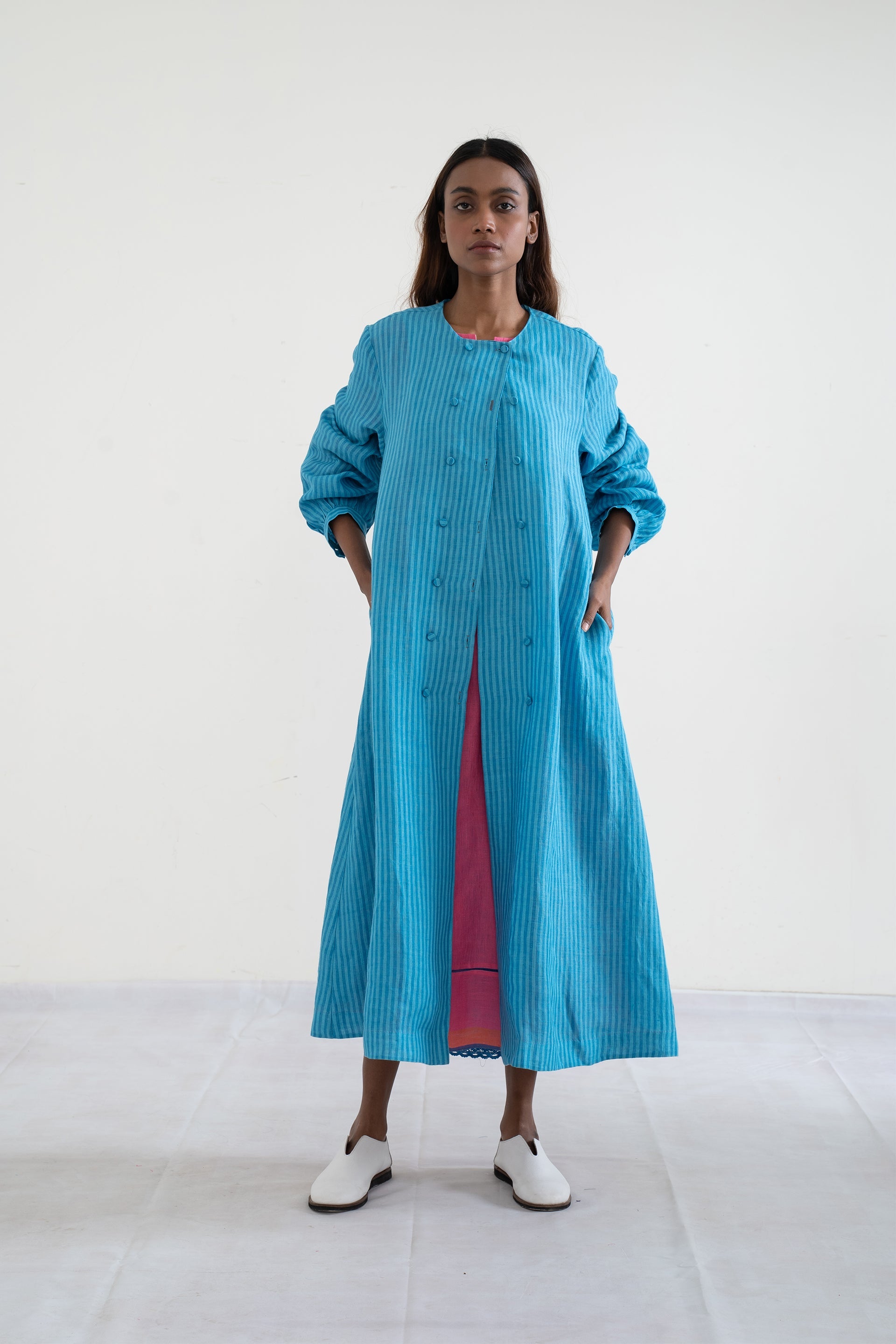 Round neck jacket in handwoven striped linen with double button details on the front