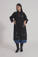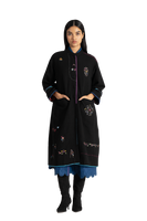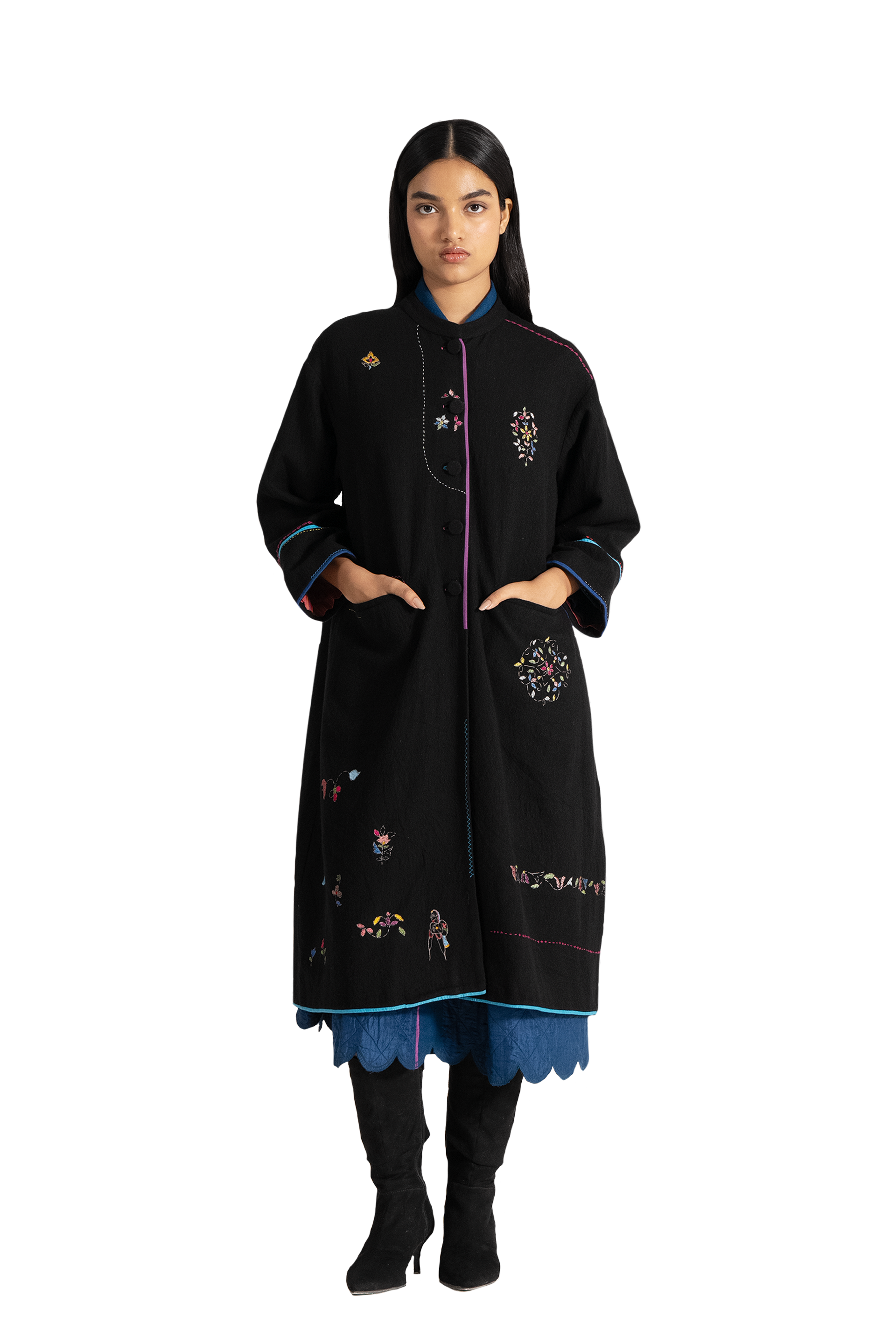 Button Down Baggy Fit Jacket With Multicolor And Delicate Hand Stitch Details And Placement Floral Hand Embroidery On Wool Linen Fabric. Lined With Handblock Print 100% Silk.