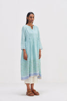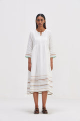 Midi dress featuring all-around pin-tucks for a tailored yet relaxed fit. Adorned with a border hand block floral print and contrast printed piping detail. Complete with selvedge in the hem for a polished finish.