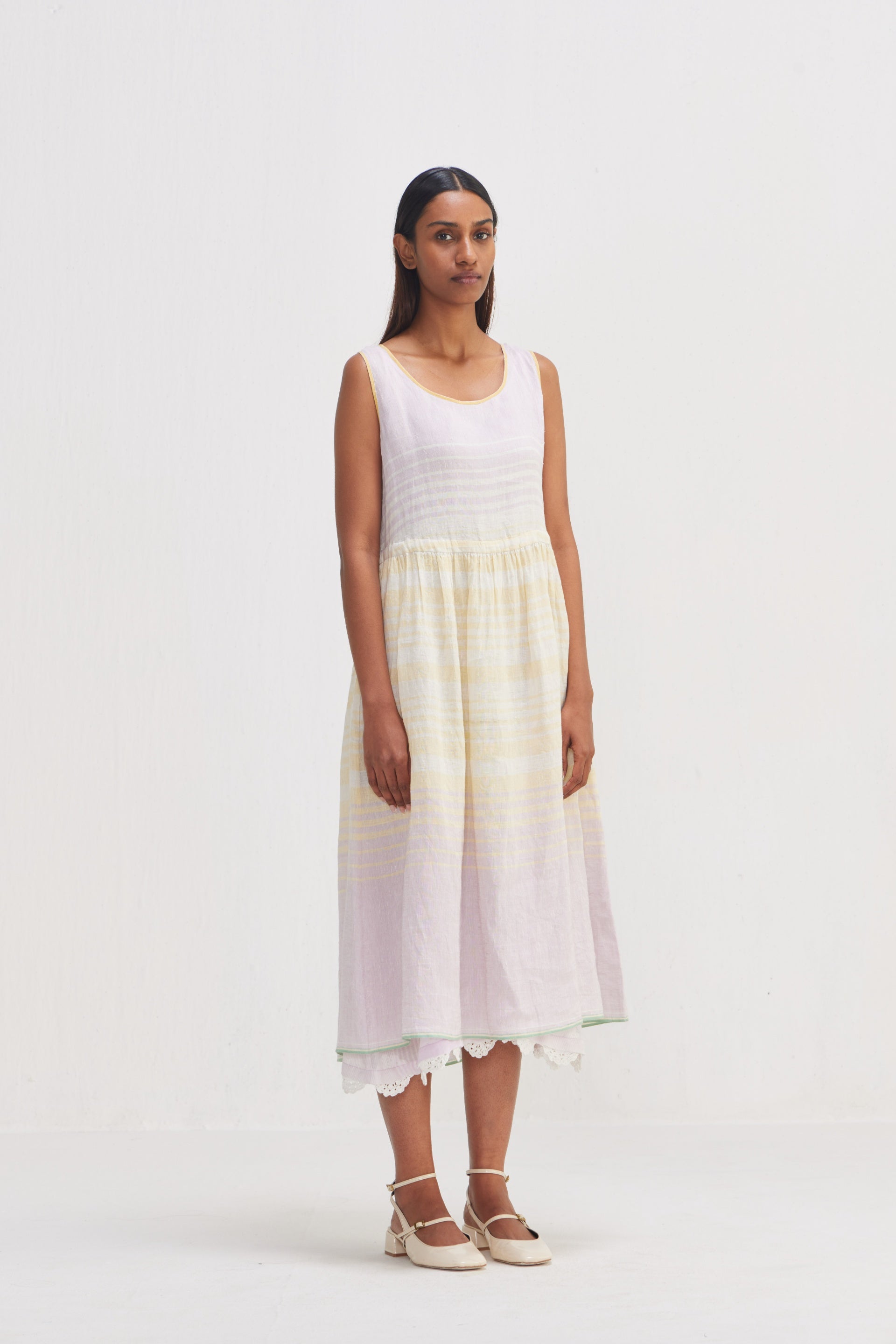 Sleeveless dress in multicolor gradation striper design showcasing an artful interplay that adds a dynamic visual appeal, elegantly crafted from handwoven yarn-dye linen. Selvedge details on the neck and hem and arm hole detail. A gathered dress for more classy and sophisticated look. A graceful tie-up detail enhances the dress's versatility and provides an adjustable fit. The dress’s selvedge accents and tie-up detail reflect a commitment to meticulous craftsmanship and refined design.
