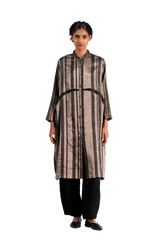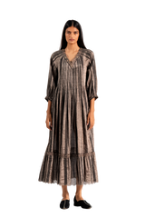 Pin-tucked dress with embroidery detail, lay ered with a linen zari hand-embroidered jacket, and styled with a contrasting red bag.