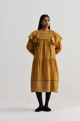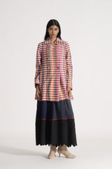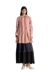 Dress with ruffle detailing and contrasting handblock-printed binding, styled with a chunky checks coat.