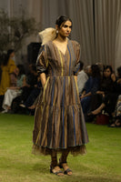 Gathered waist hand block-printed striped dress with a separate organza ruffle lining in cotton silk.