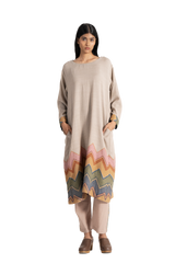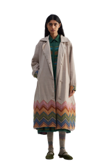 Handwoven kurta layered with the Fibi jacket styled with adjustable harem pants and contrasting chunky checks stole.