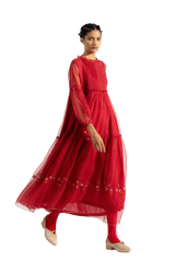 Pin-tucked tiered dress with embroidery detail, paired with a chunky check woolen skirt and styled with organza scarf and bag featuring placement embroidery.