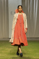 Wool tie-up dress with quilting and contrasting piping details, layered with jacquard checks wool.