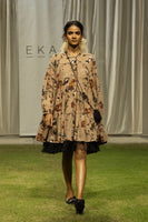 Handwoven printed wool dress featuring attached organza detail.
