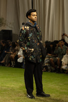 Printed kurta paired with a reversible hood, black wool trousers, and a smocked black sling bag.