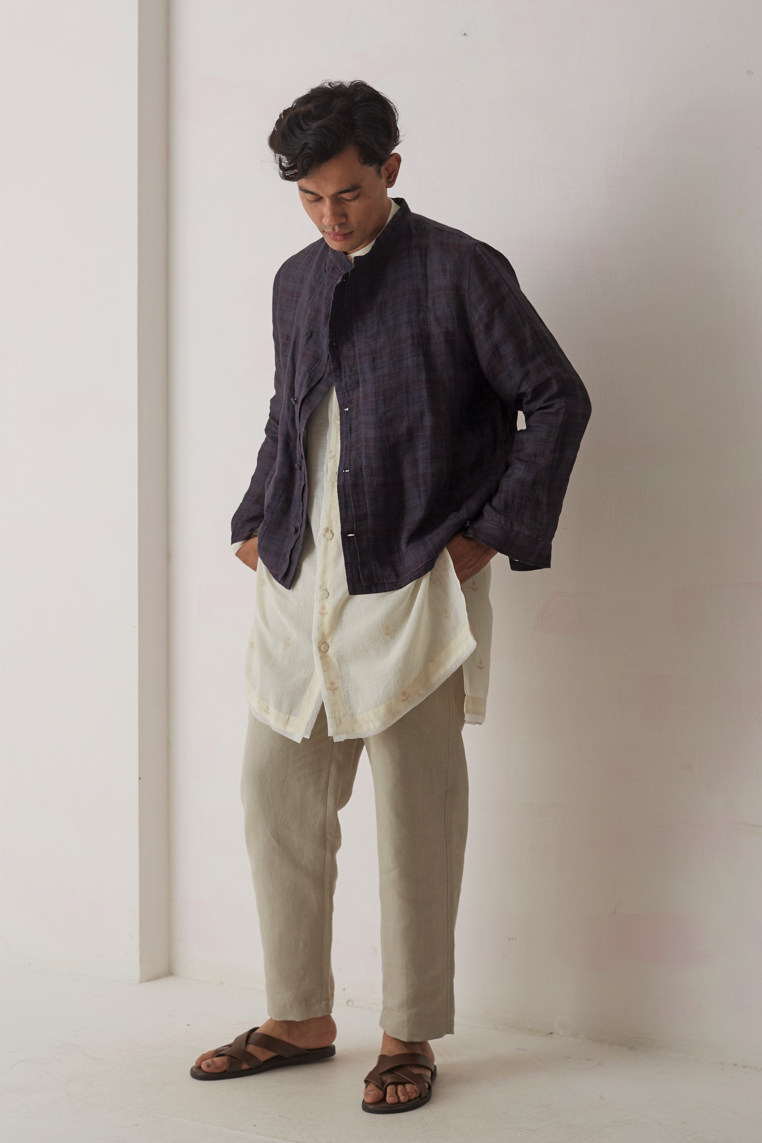 Button-down jacket in charcoal overdyed handwoven linen with an overlapping placket, mandarin collar and front pockets