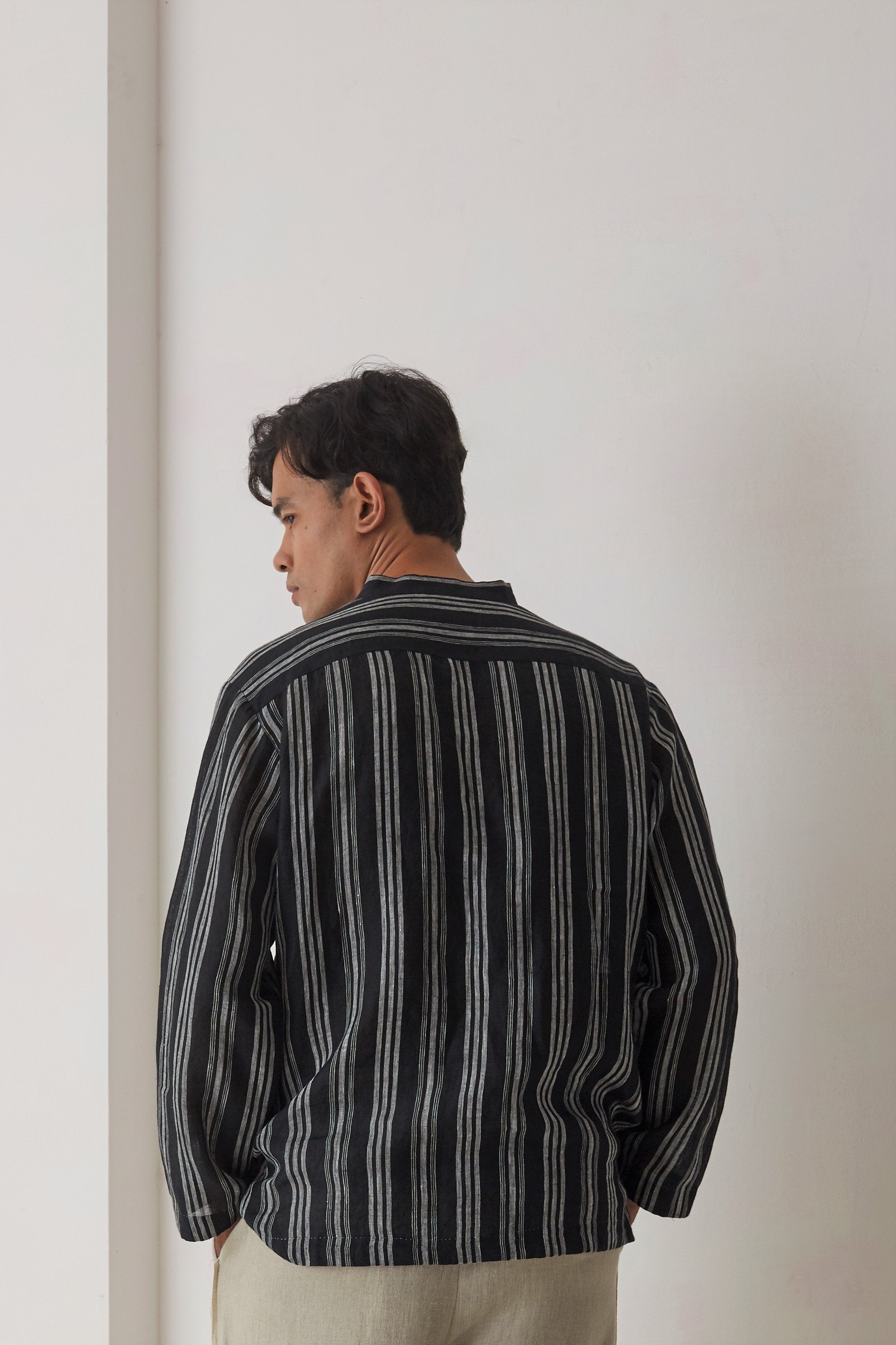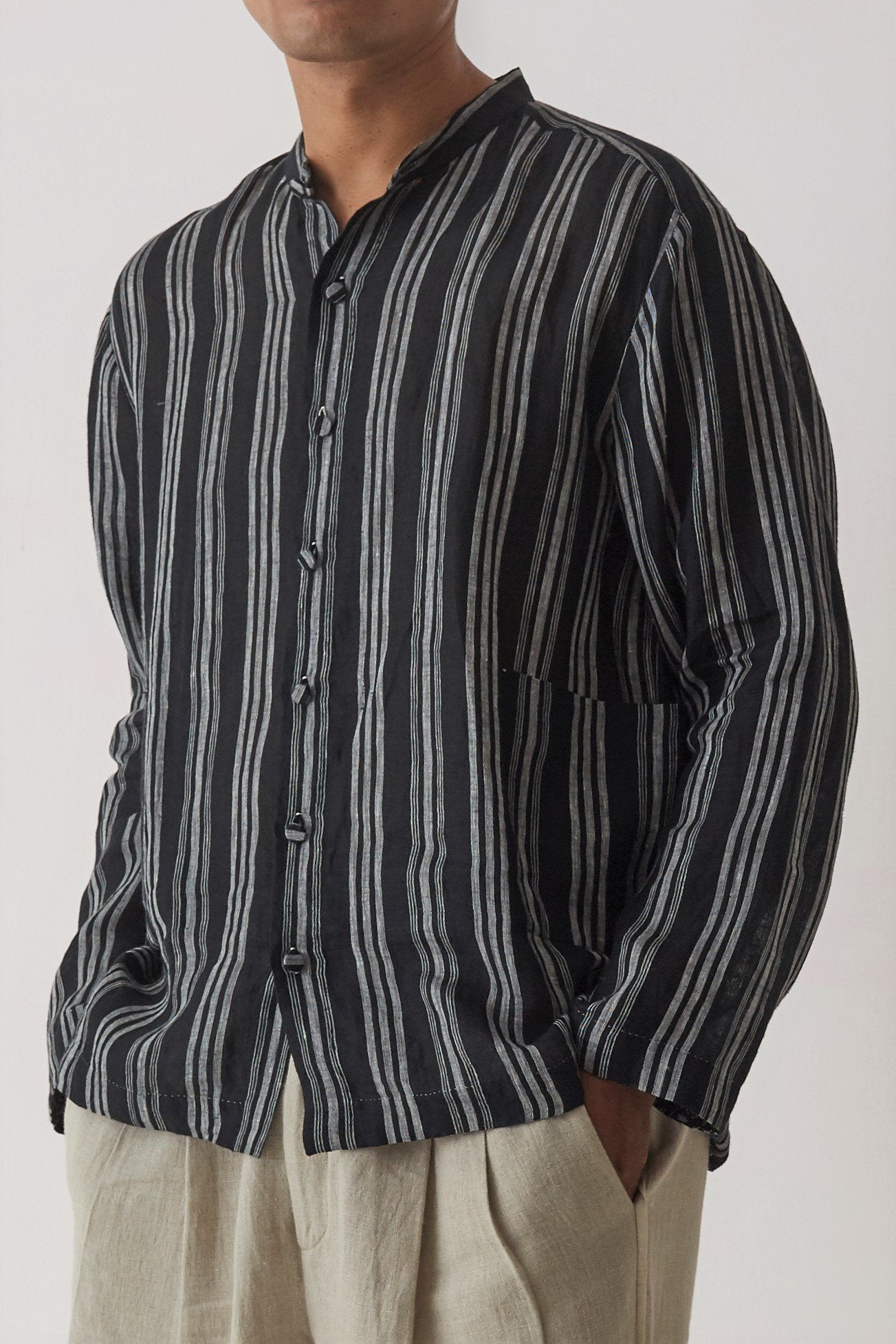 Black long sleeve shirt in handwoven linen with contrast selvedge details on the placket