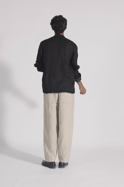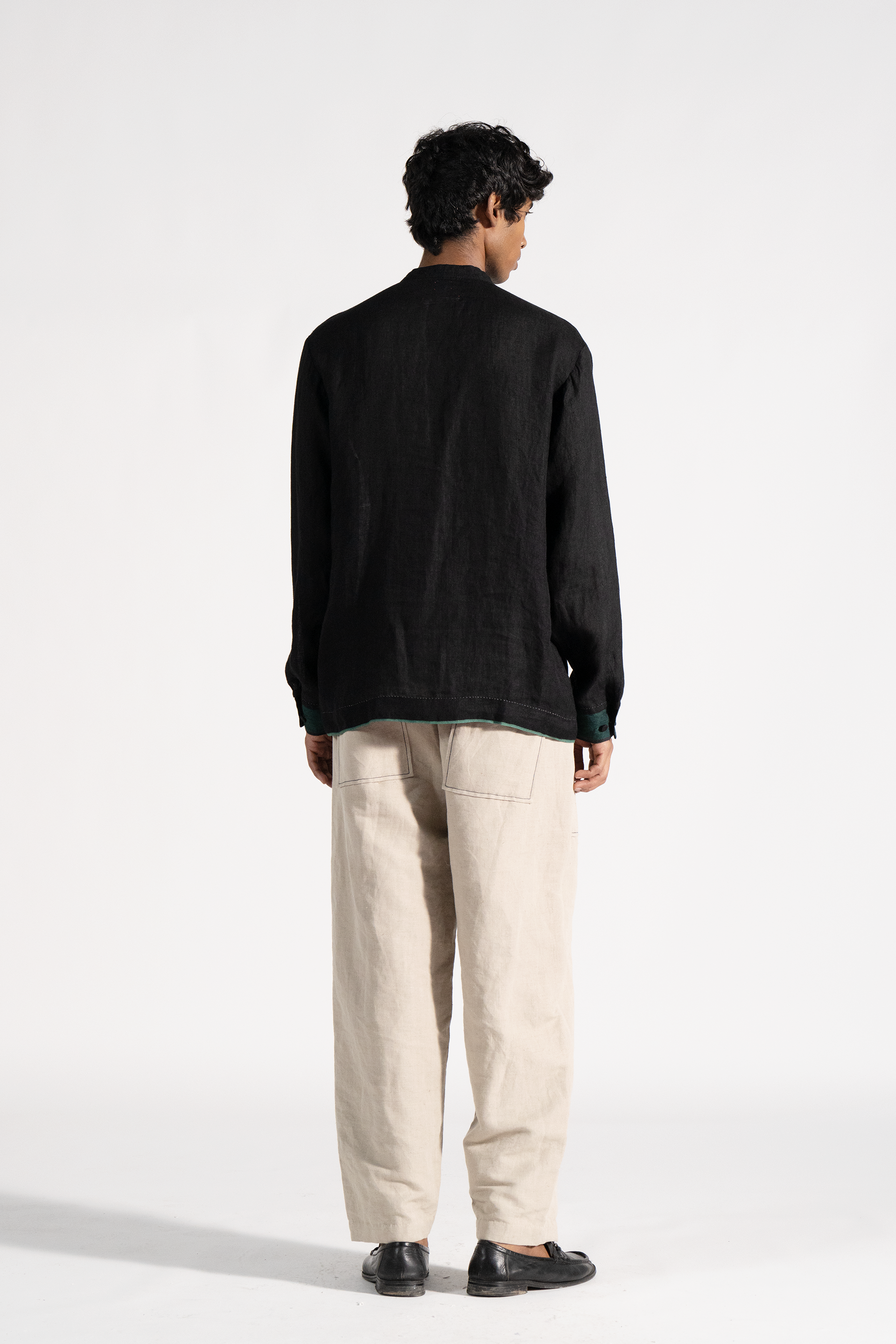 Mandrin collar straight fit button down full sleeve shirt with placket and cuff detail.
