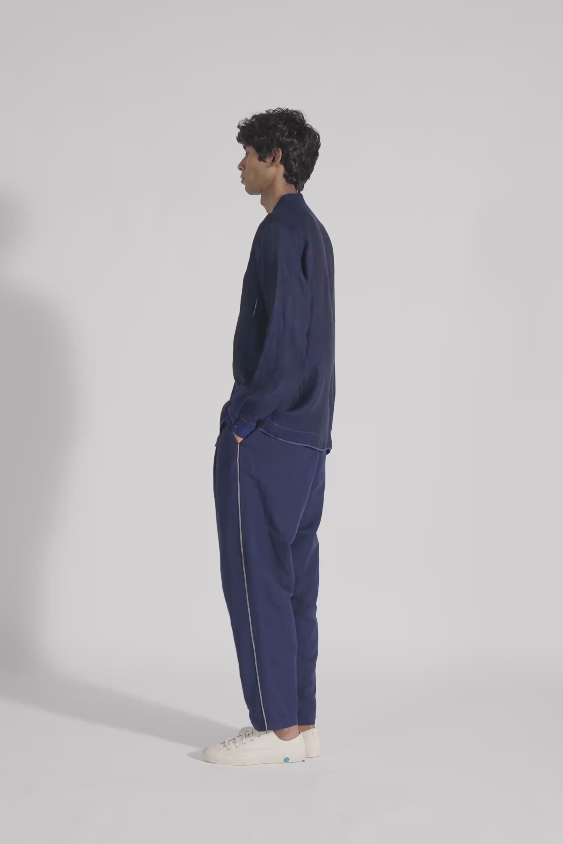 Mandrin collar straight fit button down full sleeve shirt with placket and cuff detail.