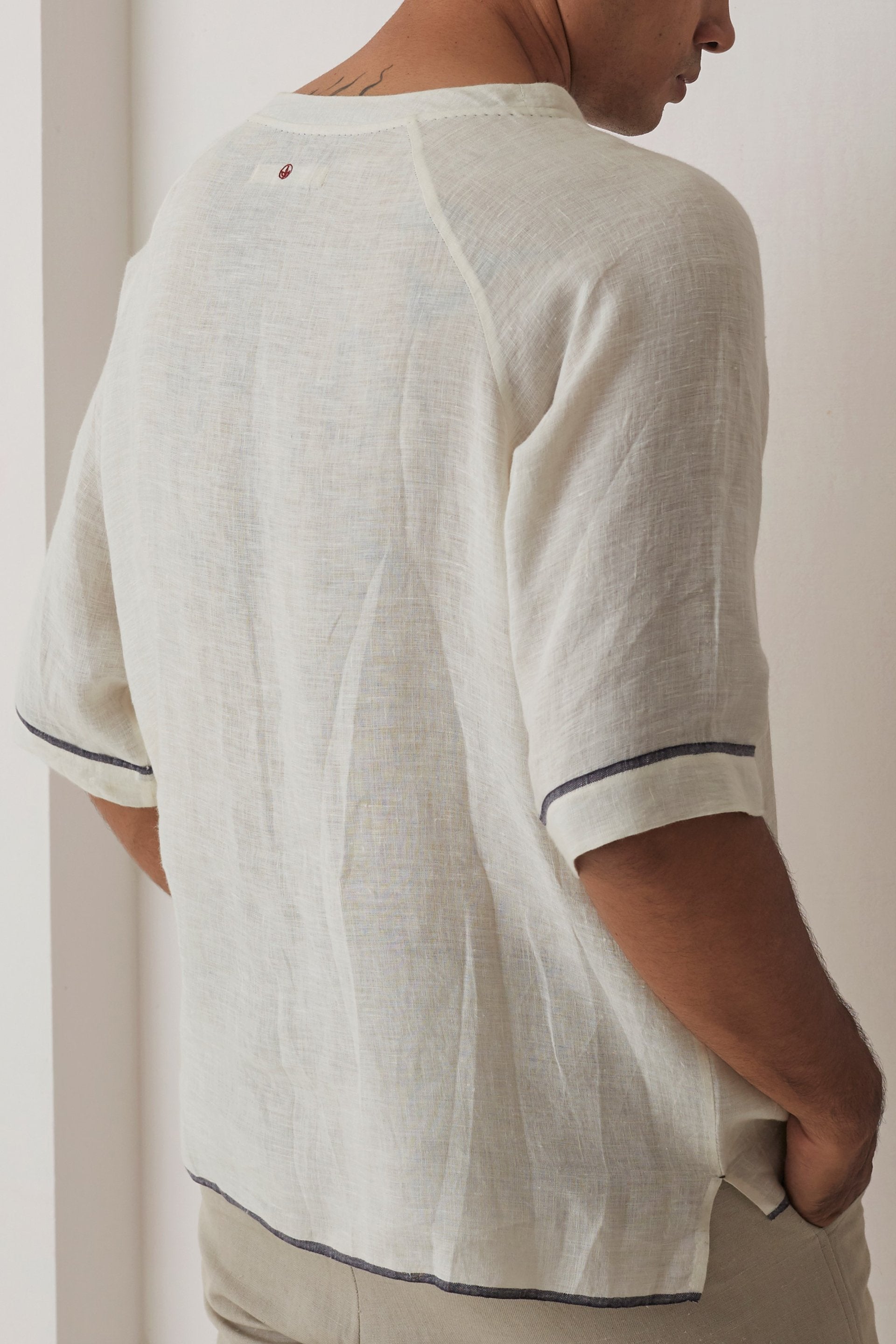White shirt in handwoven with raglan sleeves and contrast selvedge detail on the sleeves and the hem