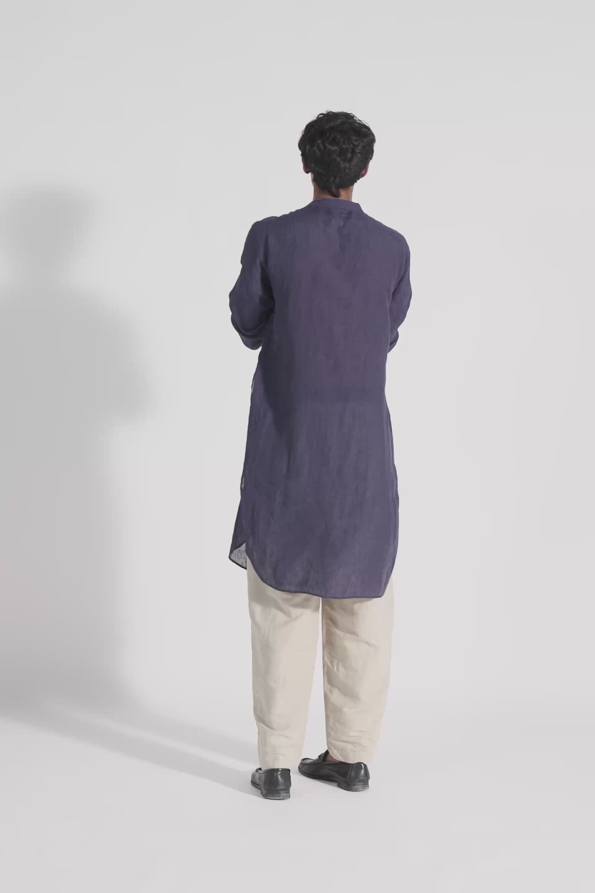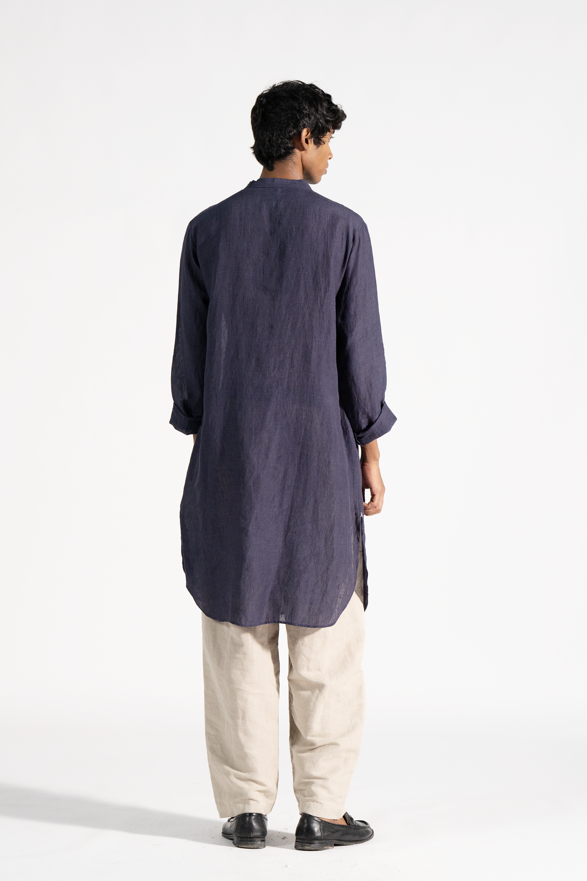 Mandarin collar full sleeve long kurta with curved hem in linen with placket detail.