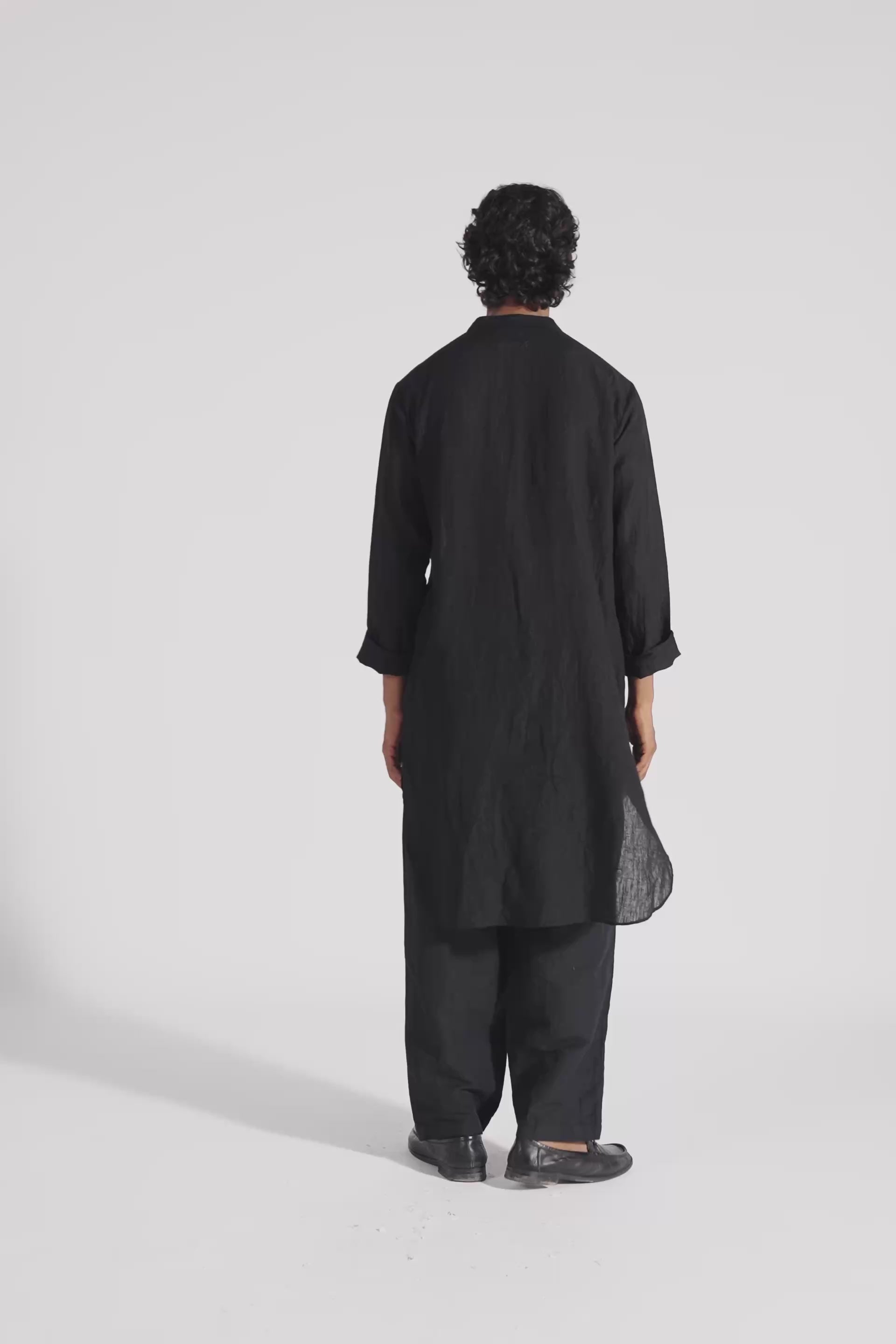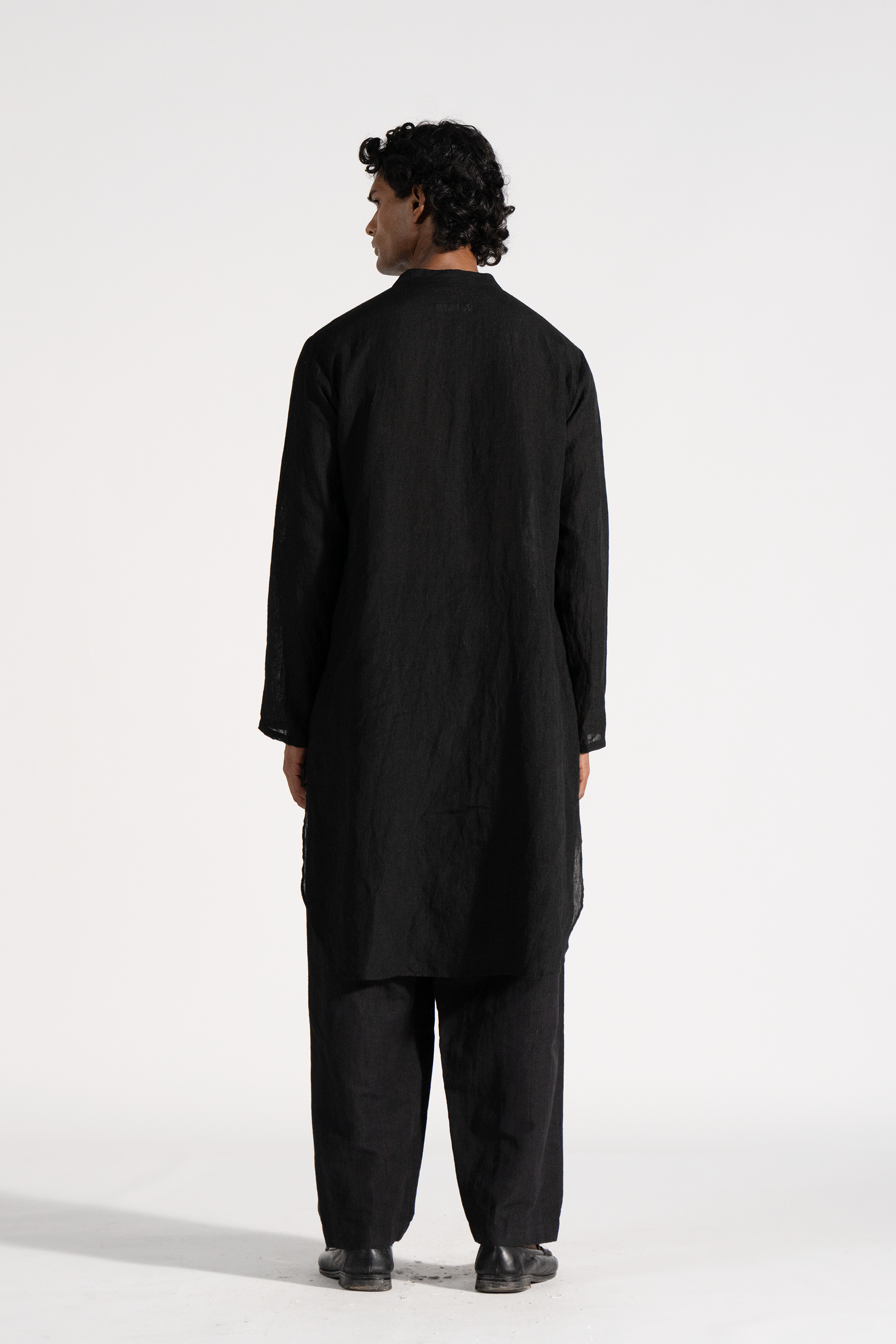 Mandarin collar full sleeve long kurta with curved hem in linen with piping detail on placket.