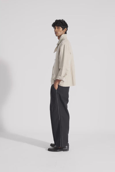 Stand collar relaxed fit button down jacket with side seam pockets in cotton linen fabric comes with an attached hand block print silk lining.