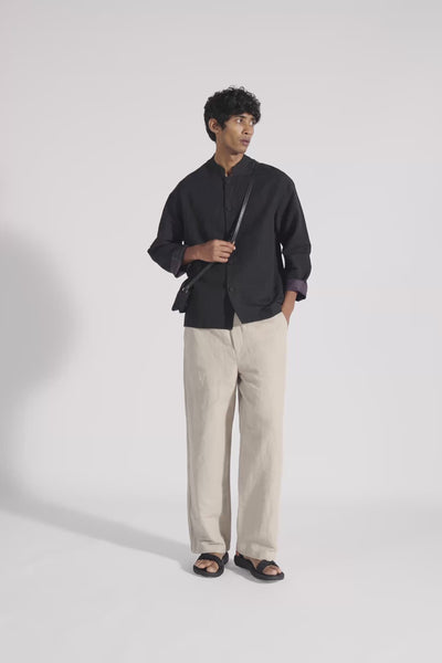 Stand collar relaxed fit button down jacket with side seam pockets in cotton linen fabric comes with an attached hand block print silk lining.