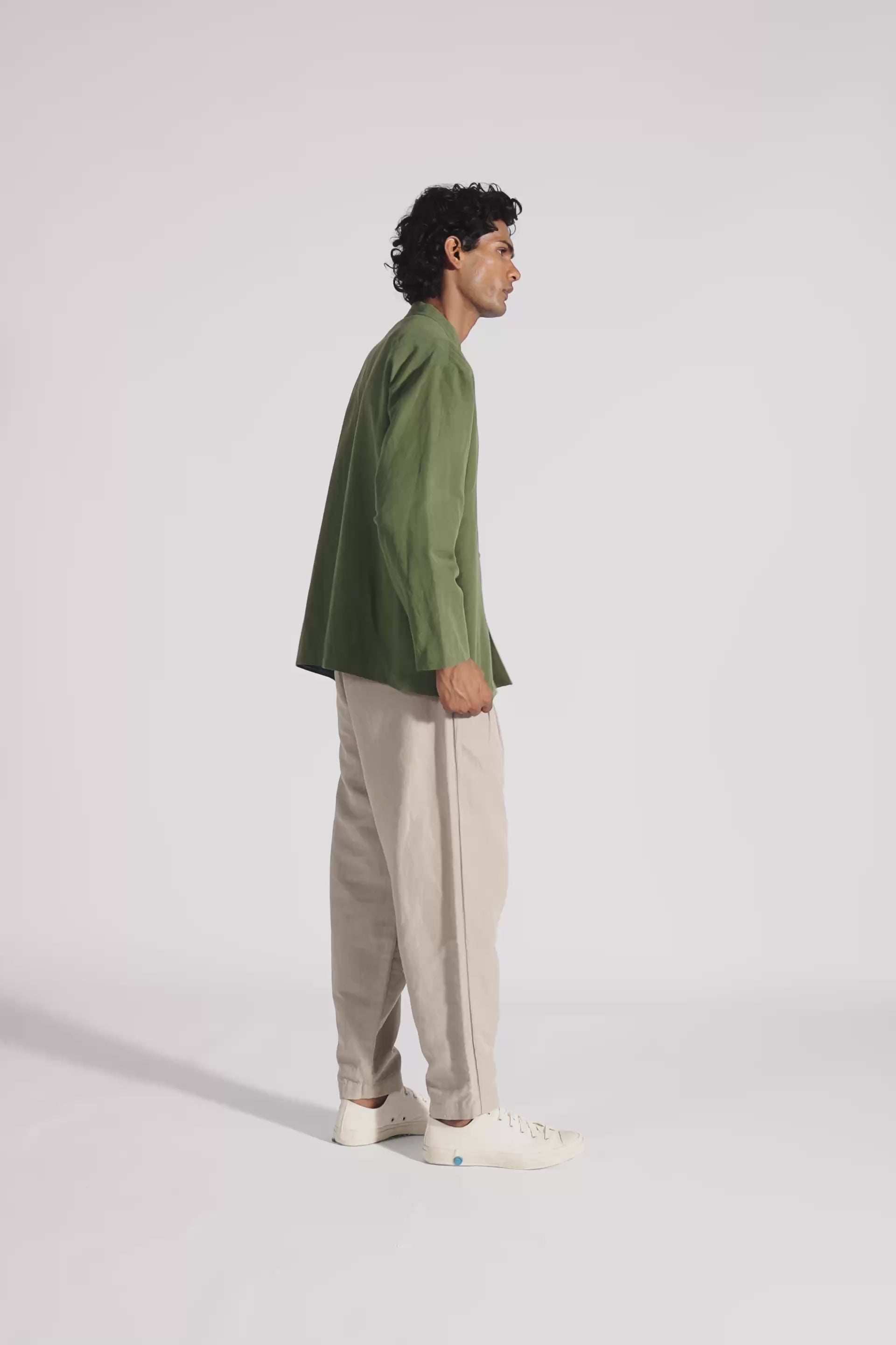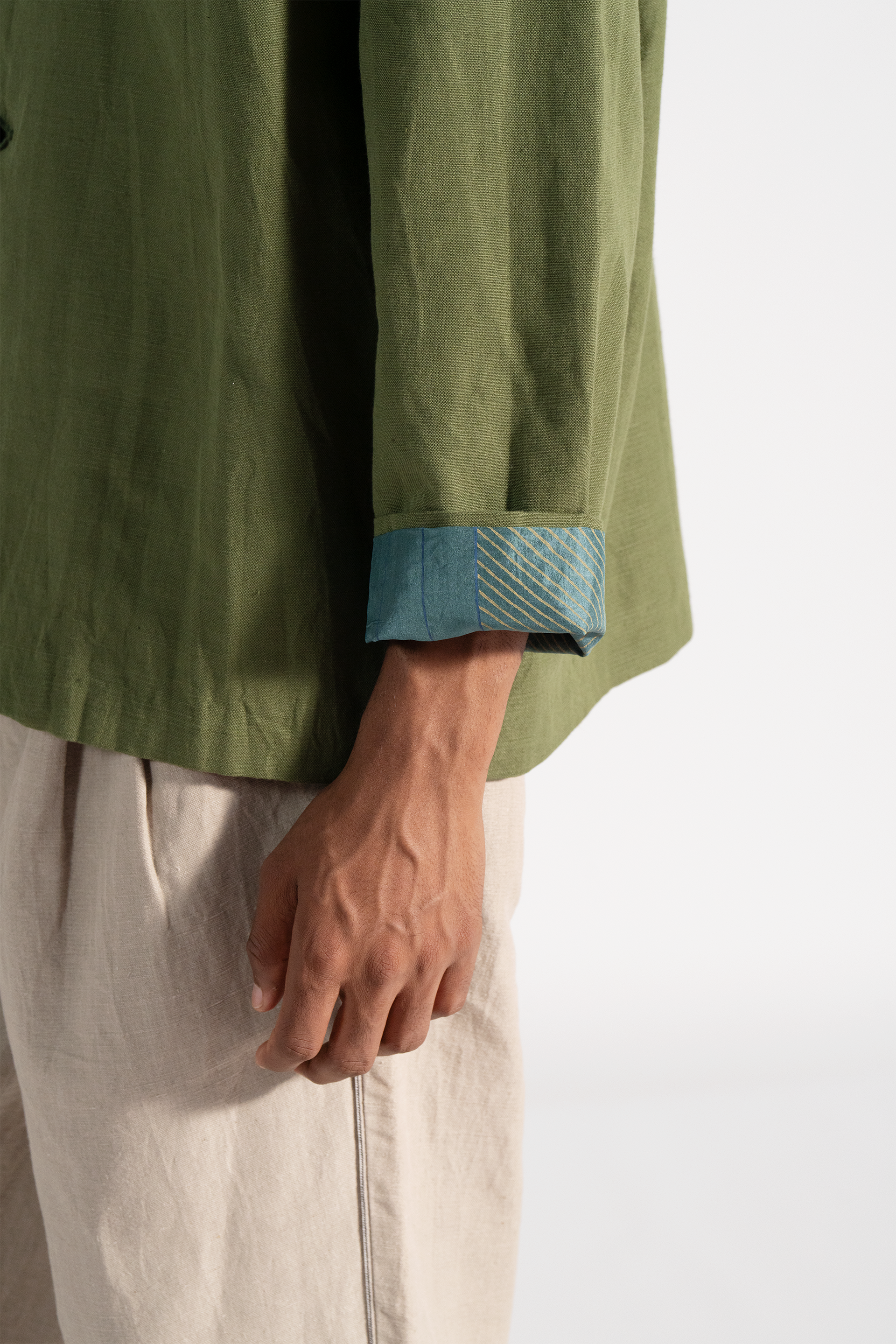 Stand collar relaxed fit button down jacket with side seam pockets in cotton linen fabric comes with an attached hand block print silk lining.