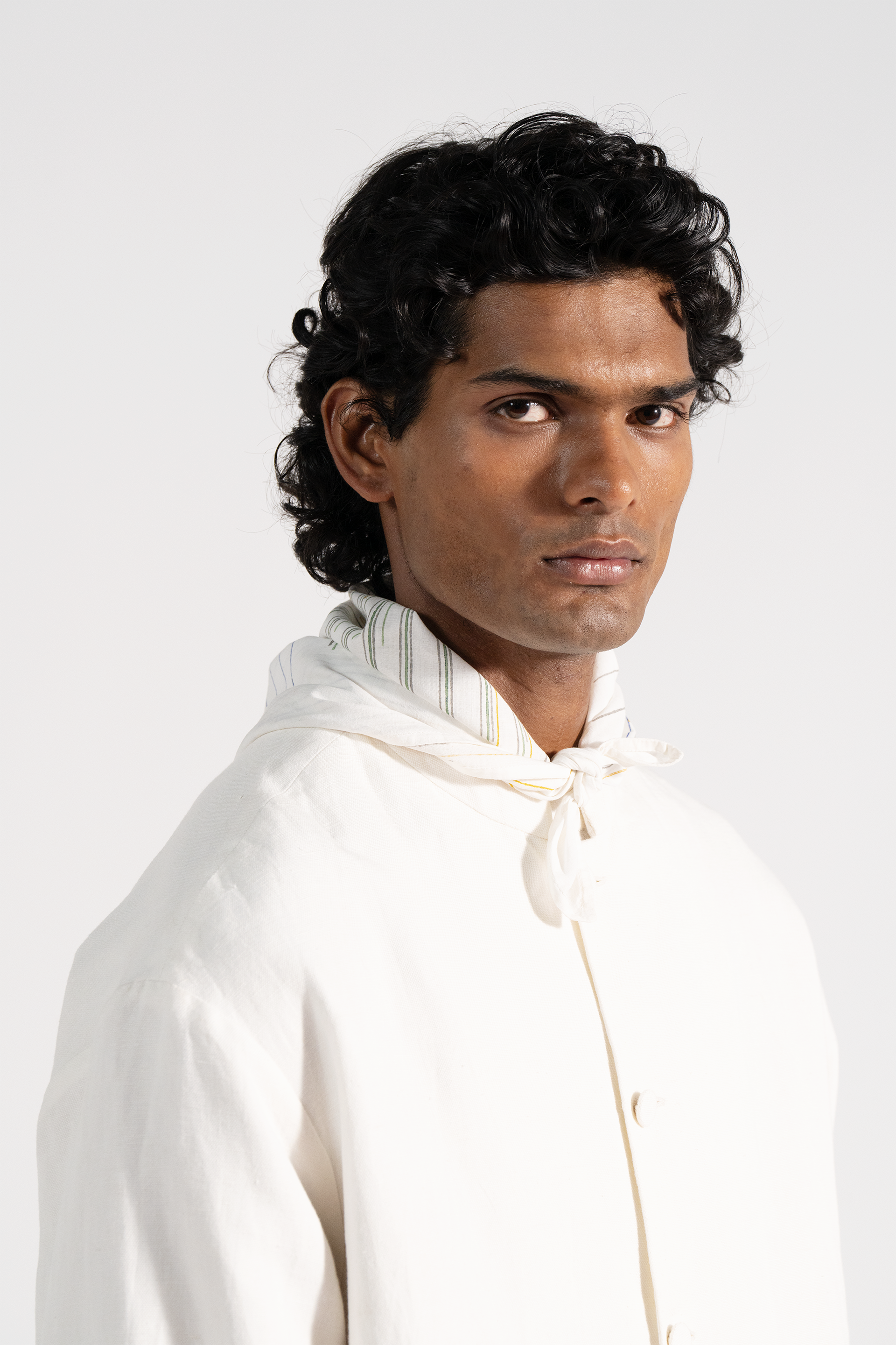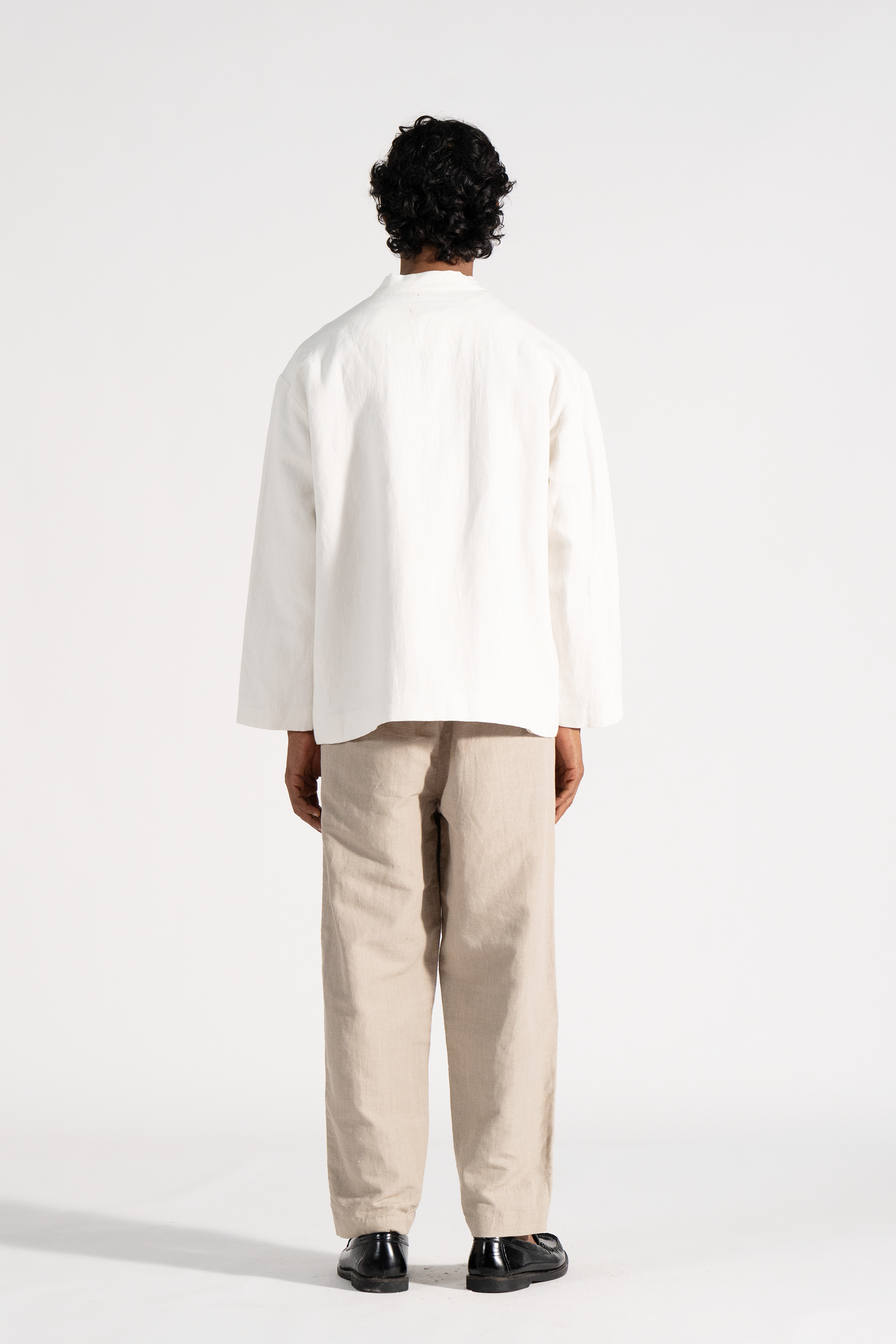 Stand collar relaxed fit button down jacket with side seam pockets in cotton linen fabric comes with an attached hand block print silk lining.