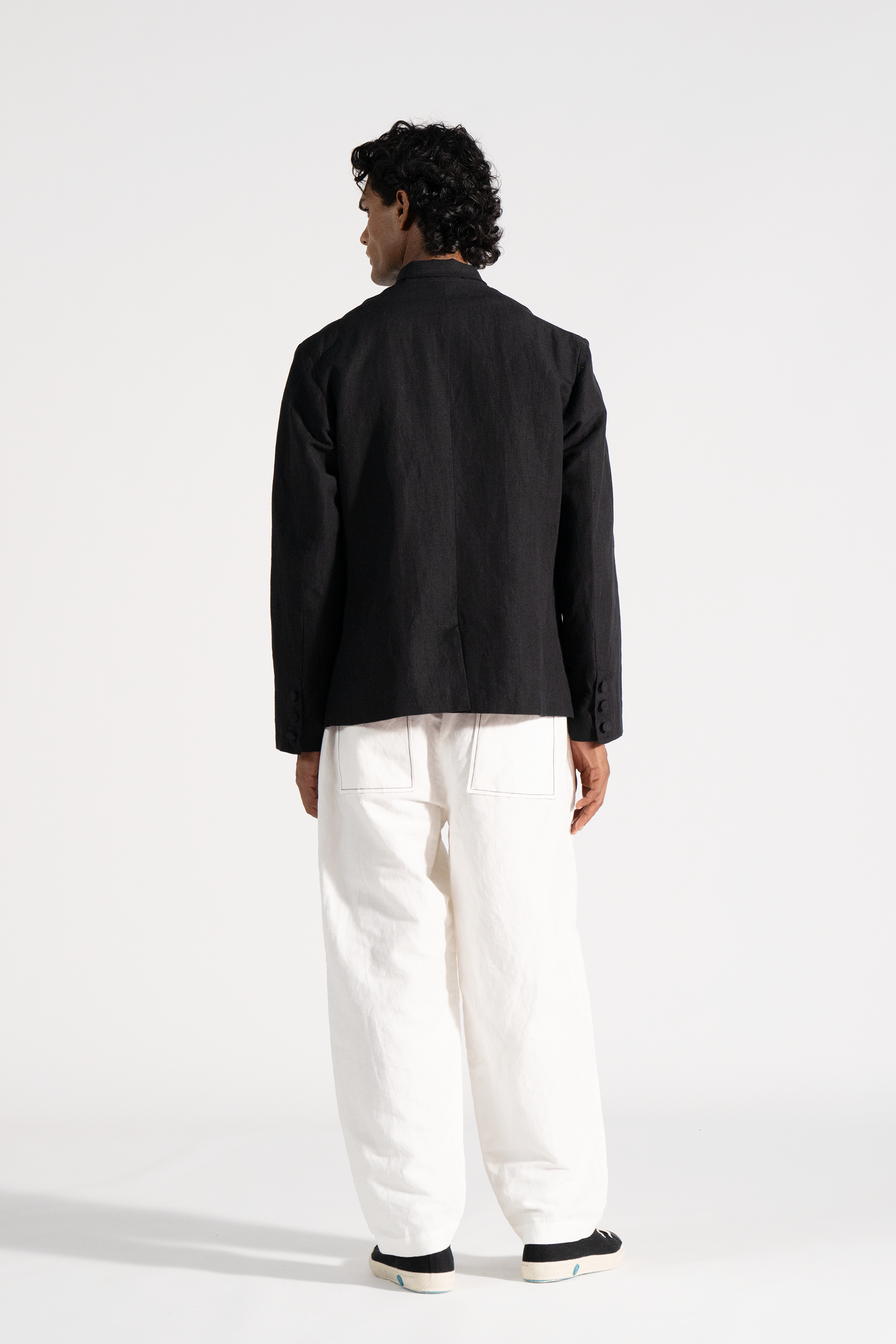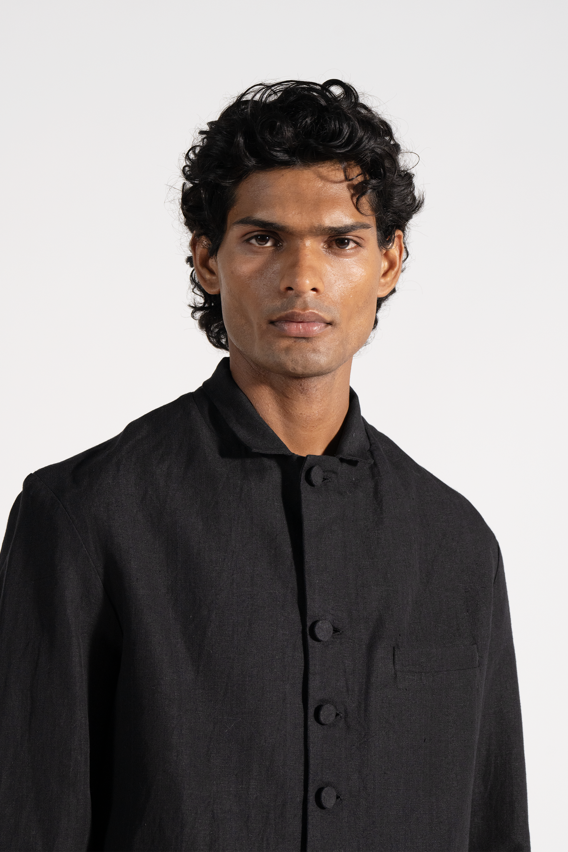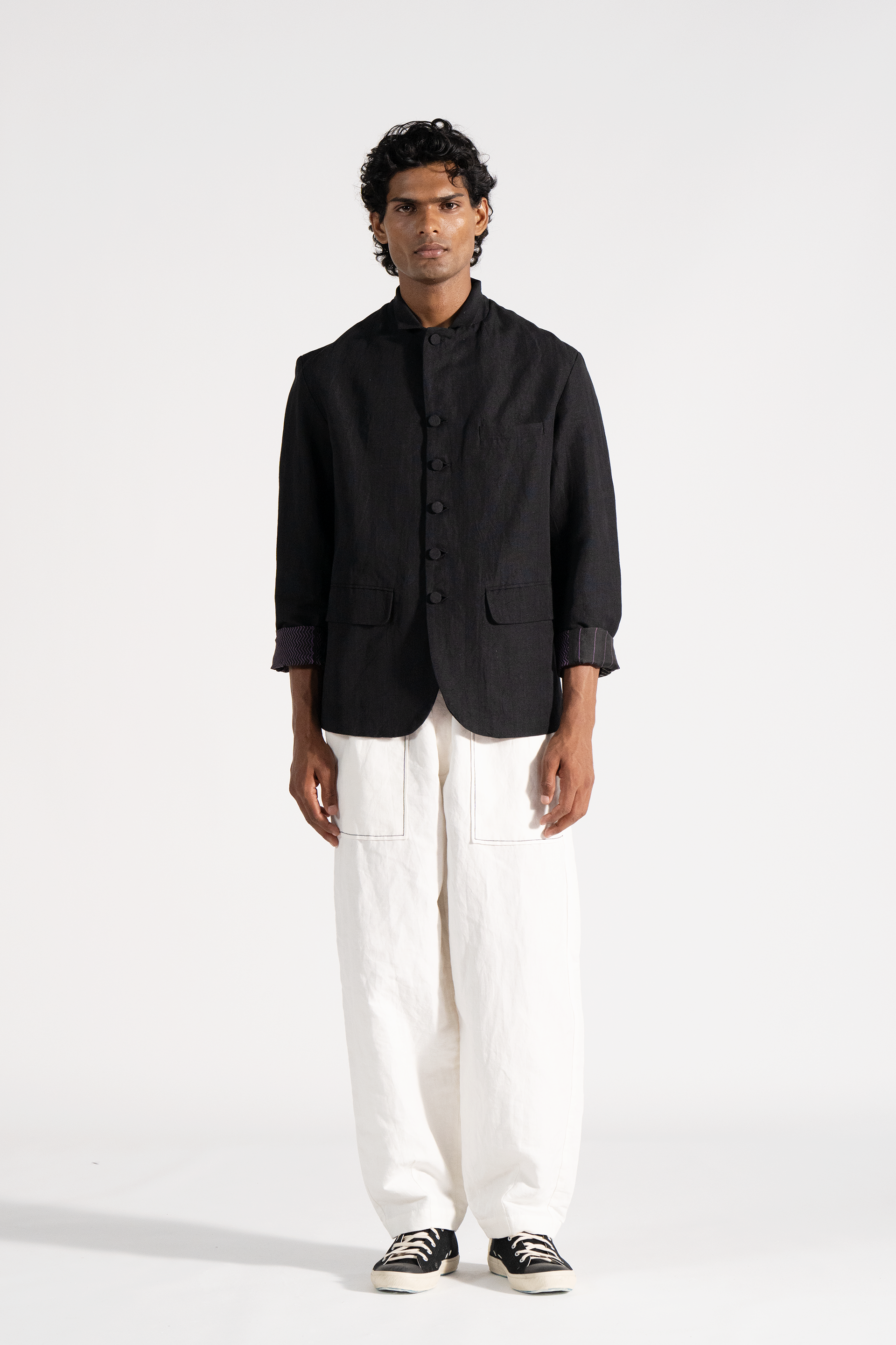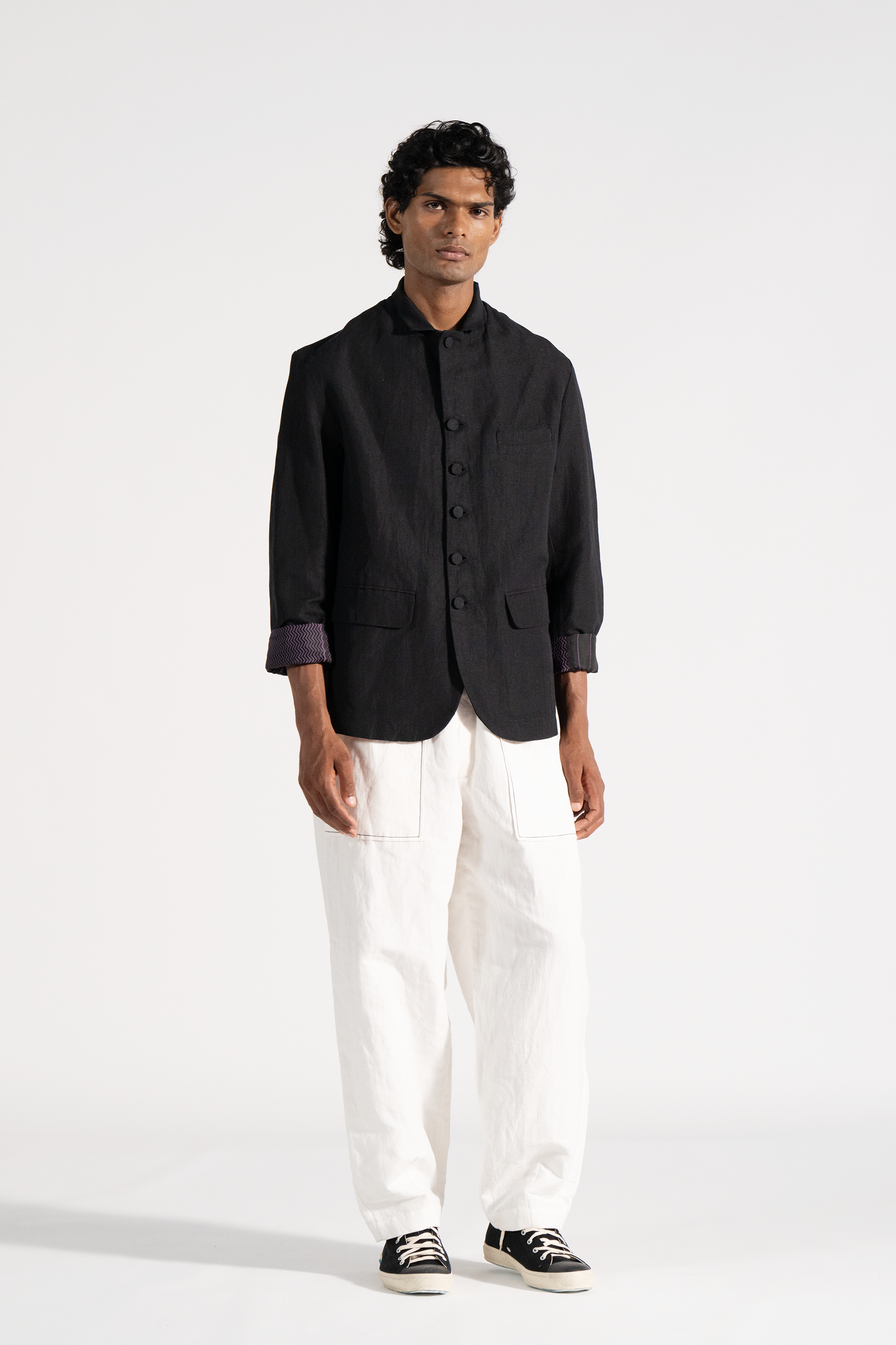 Notch collar button down full sleeve round hem straight fit jacket with flap pockets in cotton linen, comes with an attached handblock print silk lining.