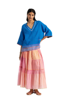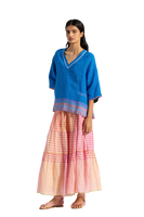 Basic v neckline relaxed fit top with 3/4 sleeve and contrast border and salvedge detail across the hem and sleeves. Constructed in solid with border 100% linen fabric.