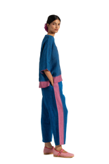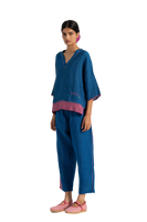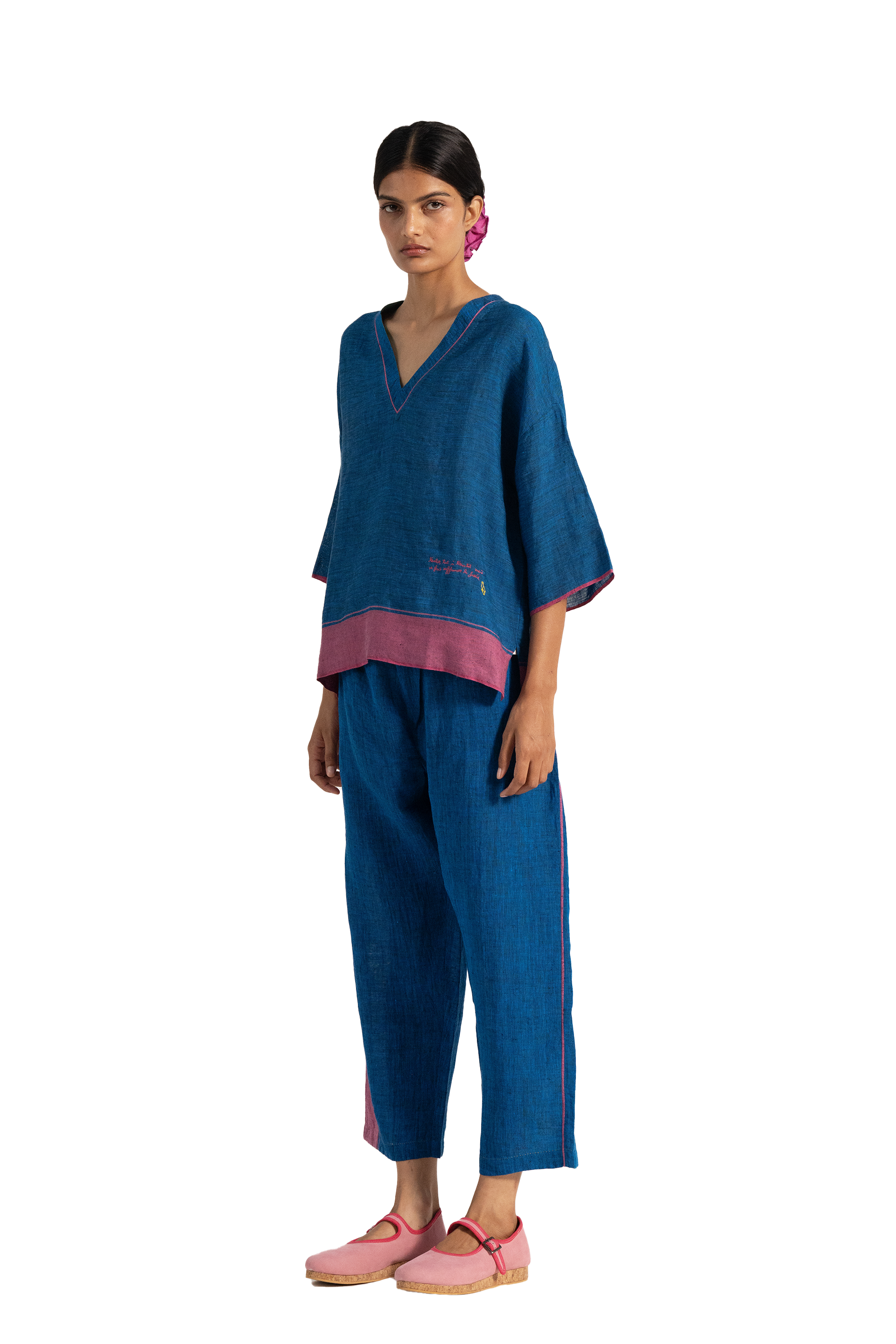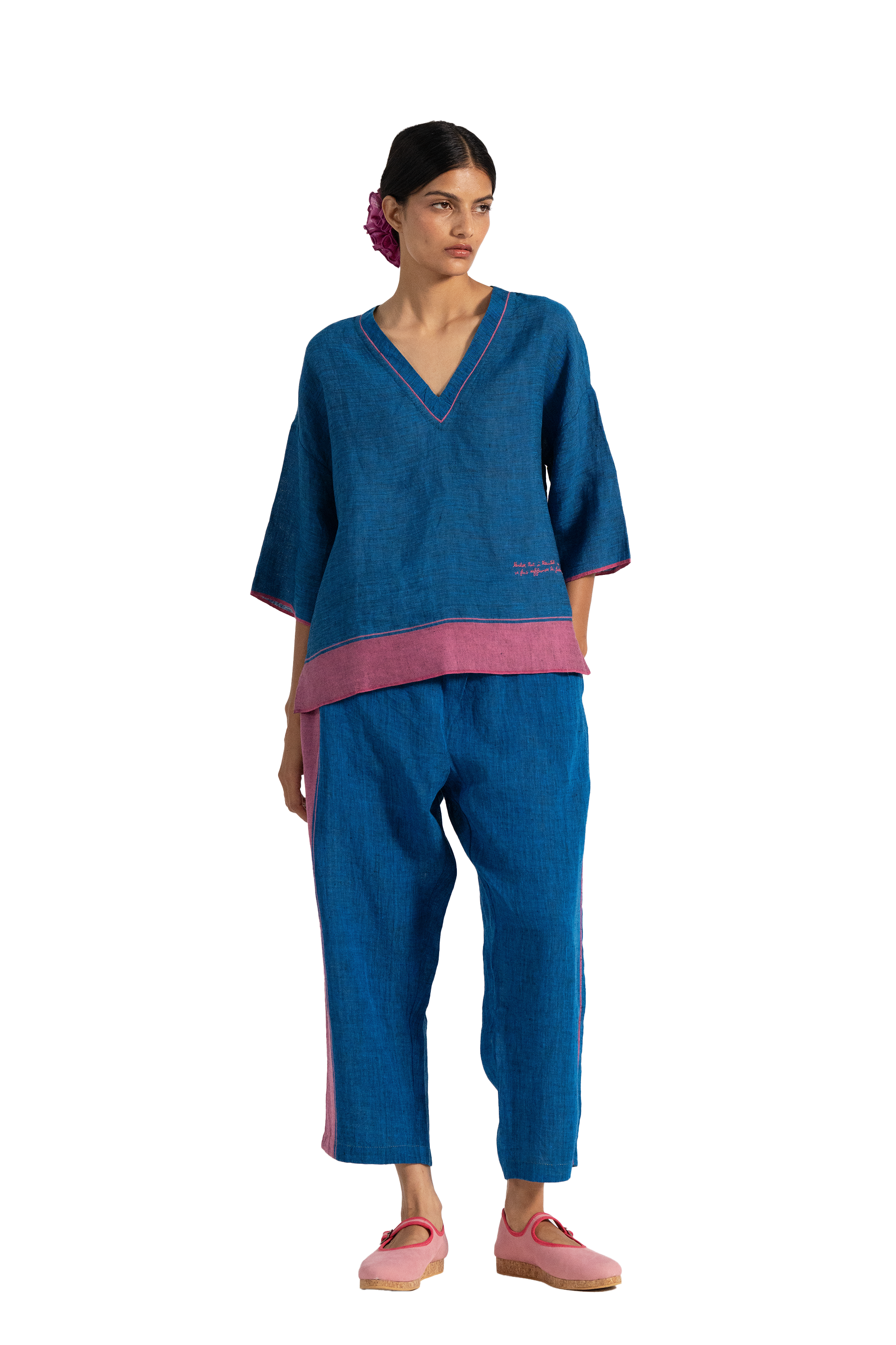 V-neck oversized top in 100% linen. With text-print embroidery on side.