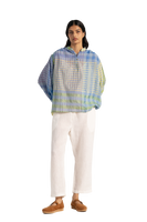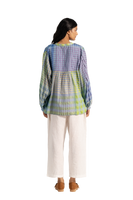 Multicolor checkered puff sleeved top in cotton silk blend.