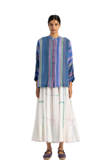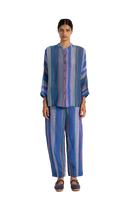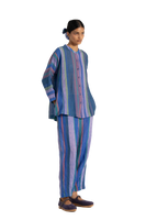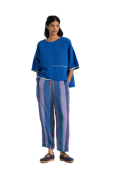 Relaxed fit tapered hem trouser with dart detail on hem. Constructed in multicolor striper cotton linen fabric.