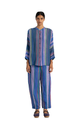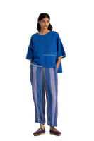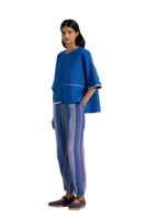 Relaxed fit boat neck top in 100% linen fabric. With drop shoulder detail and handblock print striper piping insert and applique detail.