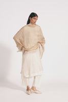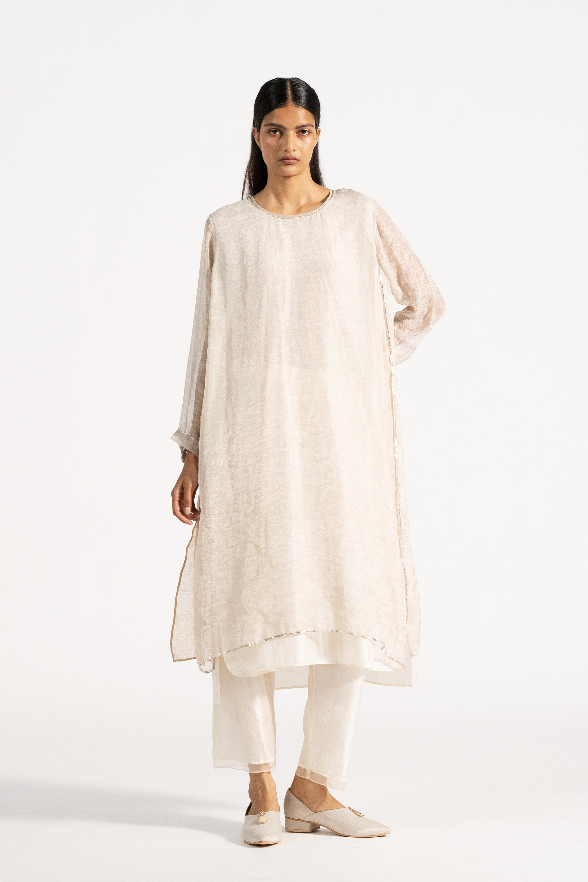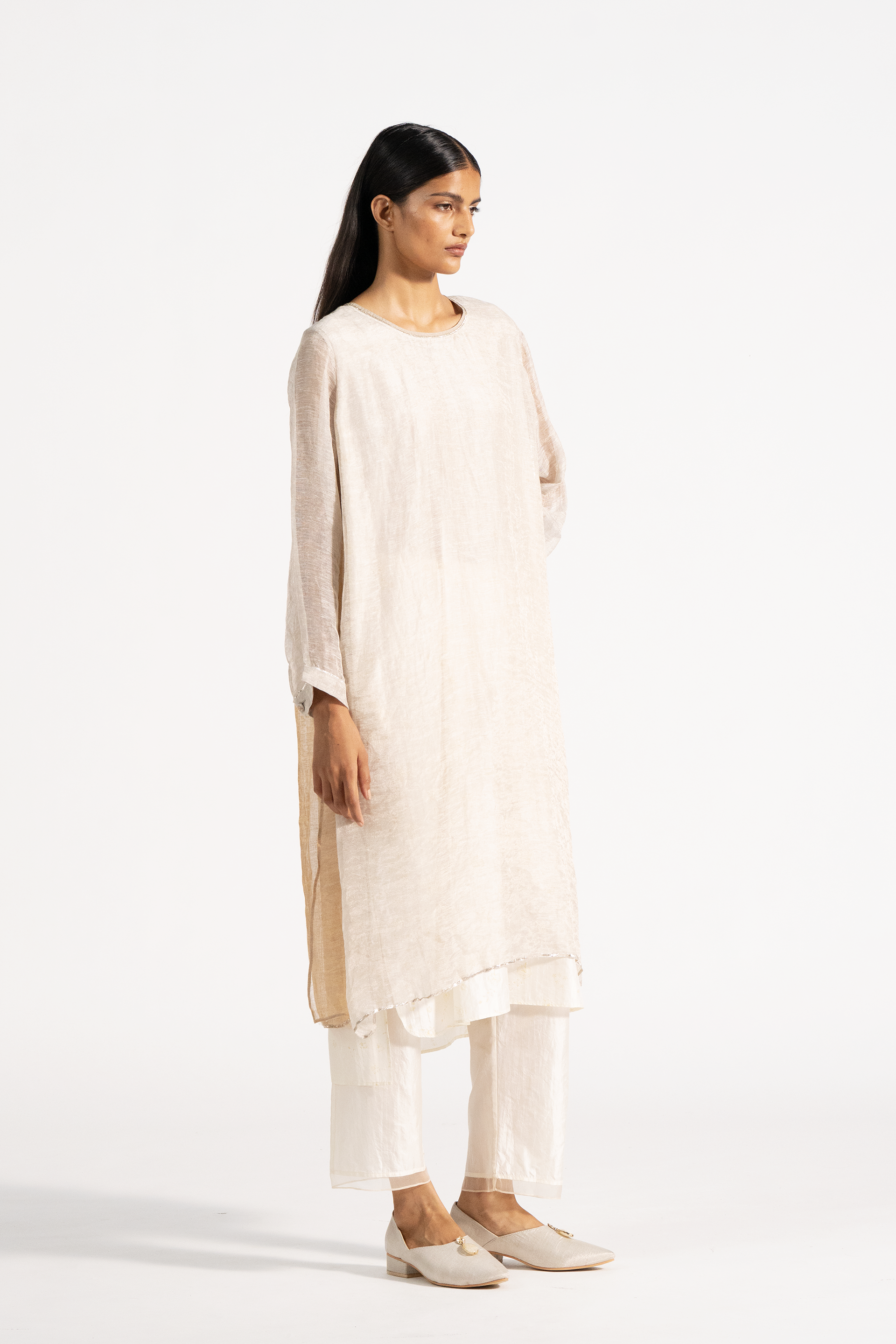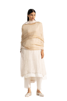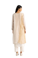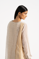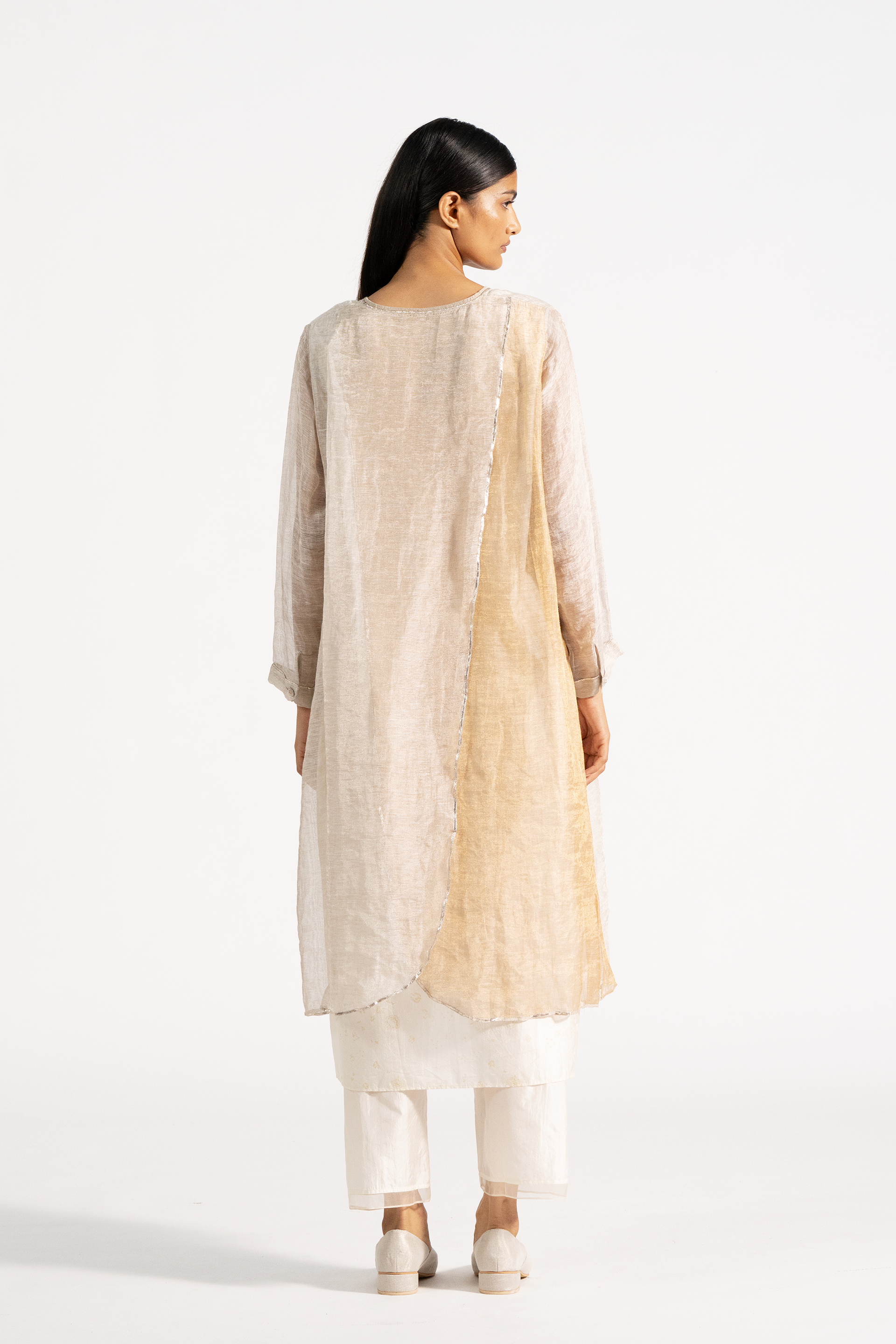 Linen zari gauze dress with two-colored panels at back and gota finishes at the hem. Comes with a separate silk trouser.
