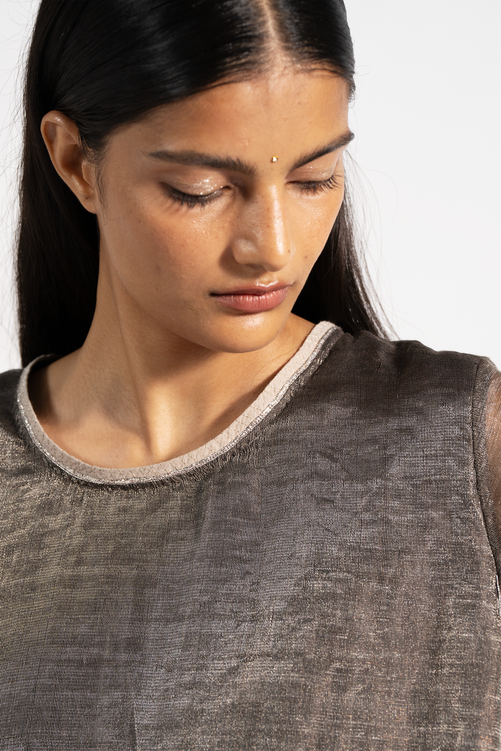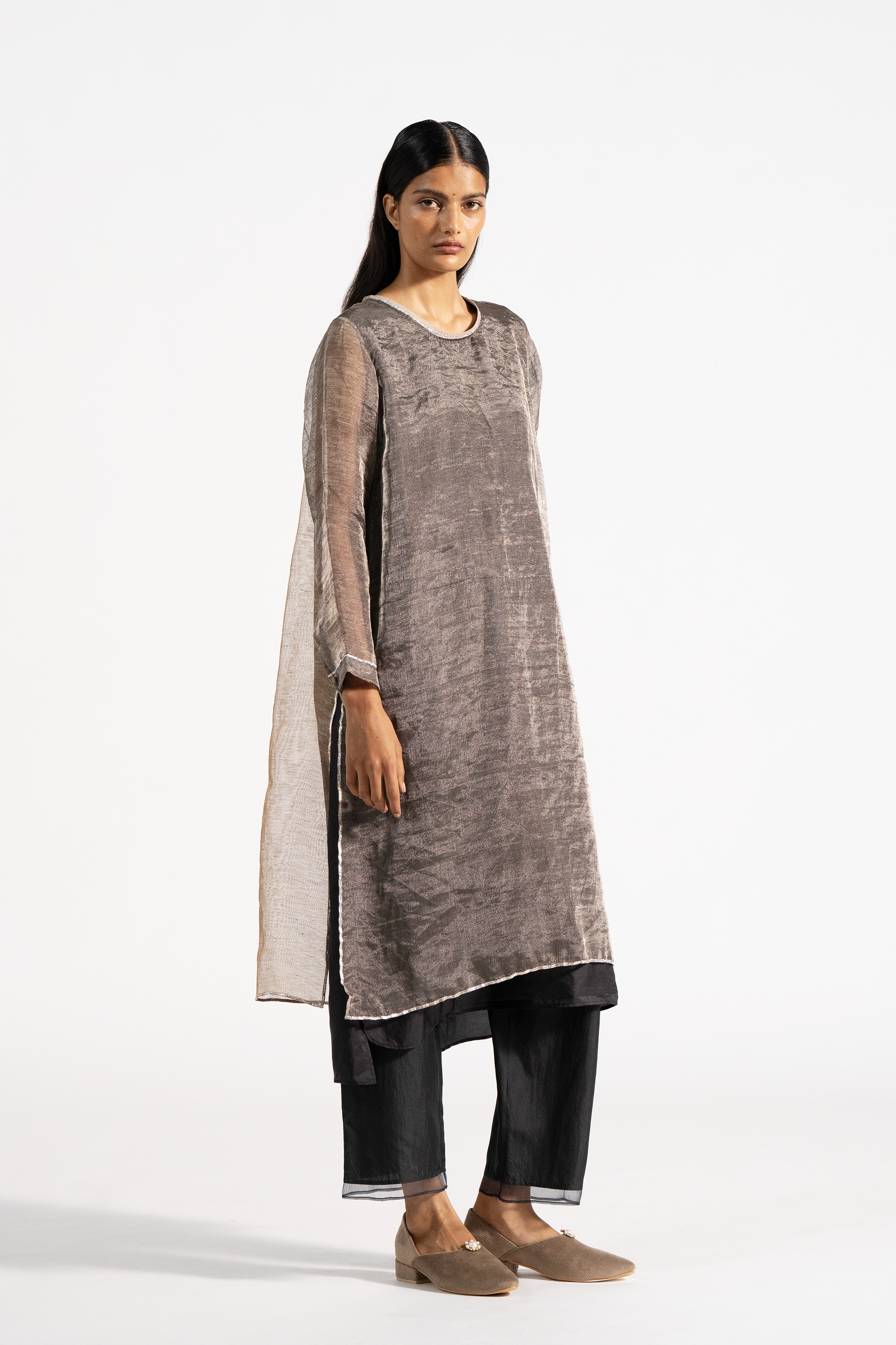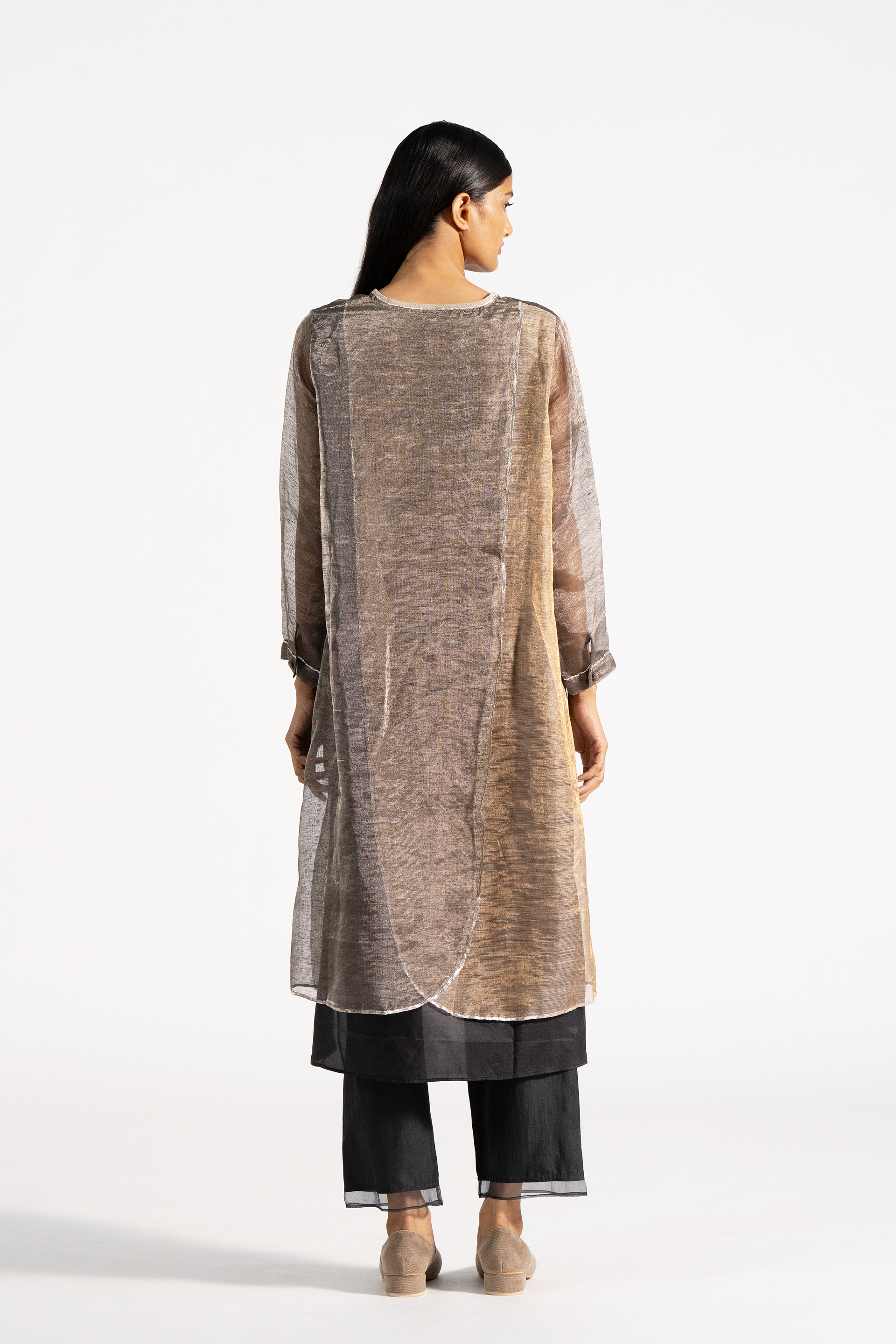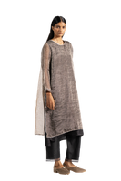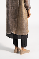 Linen zari gauze dress with two-colored panels at back and gota finishes at the hem. Comes with linen zari trousers with tissue order on hem.