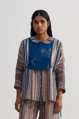 Mid raise baggy fit trouser with side pockets. Constructed in contrast handblock print over tone-on-tone thick and thin self striper fabric. Finished with solid 100% silk piping on the seam.