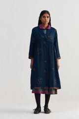 A-line round neckline midi dress. Constructed in solid 100% wool with placement intricate sozni hand embroidery. Finished with facing detail.