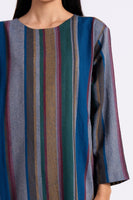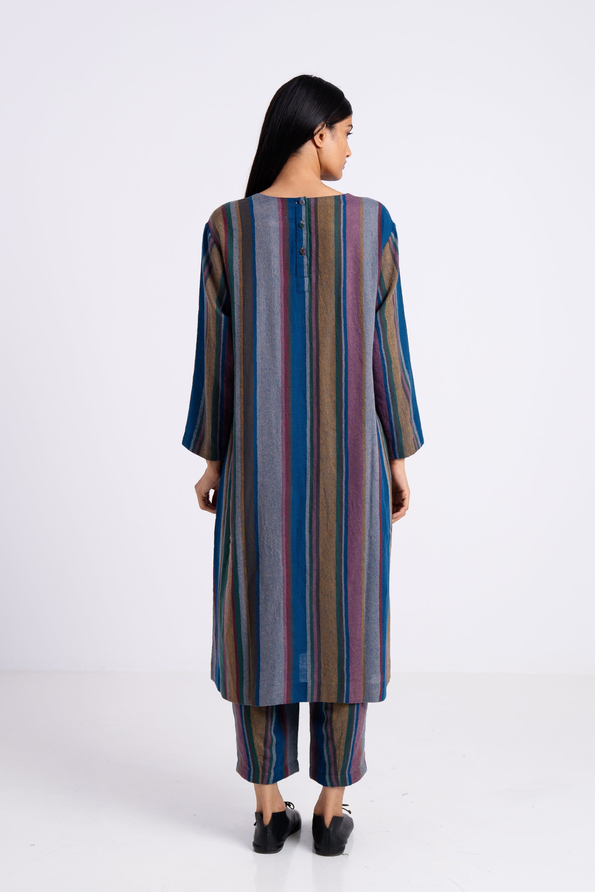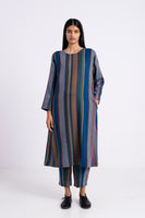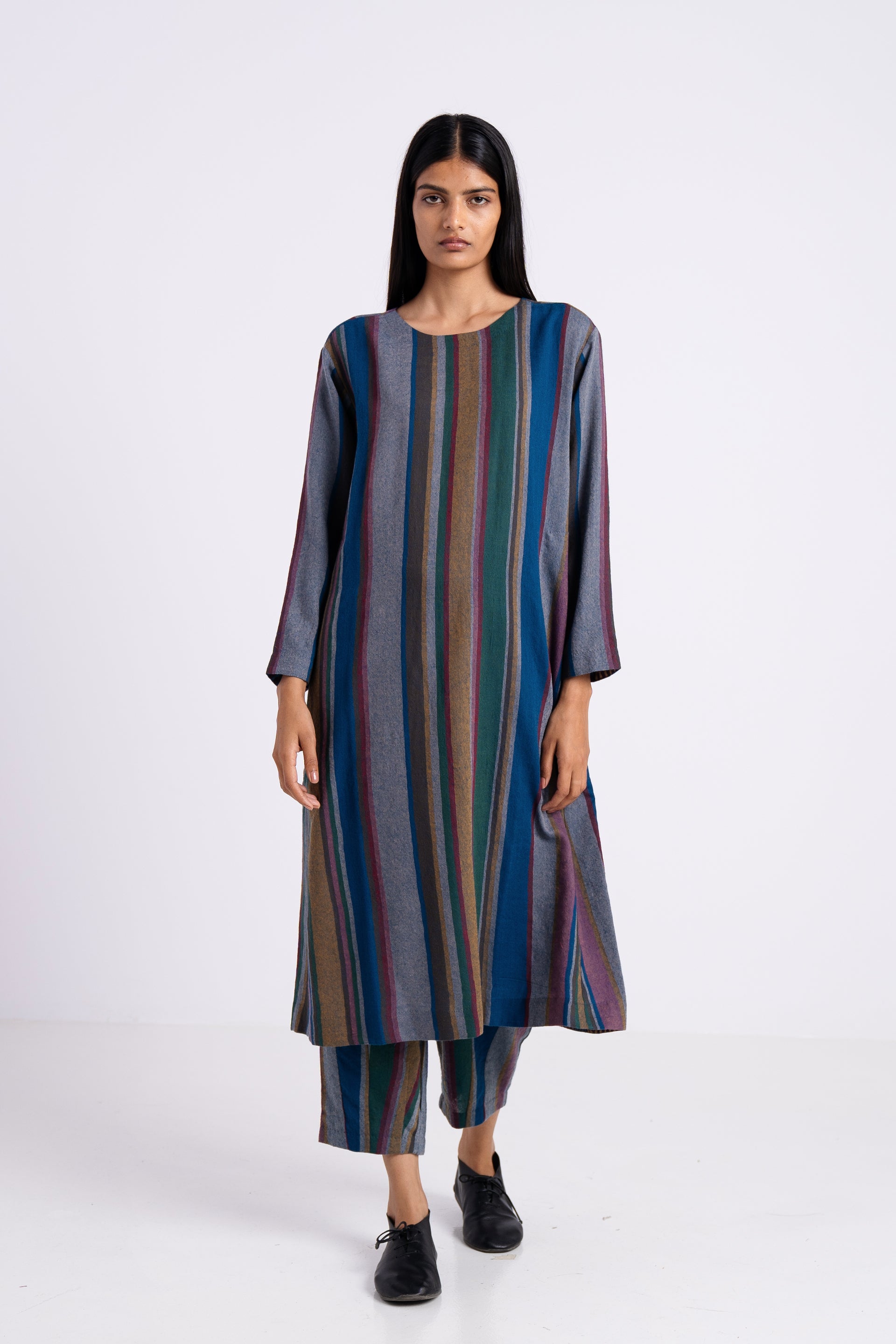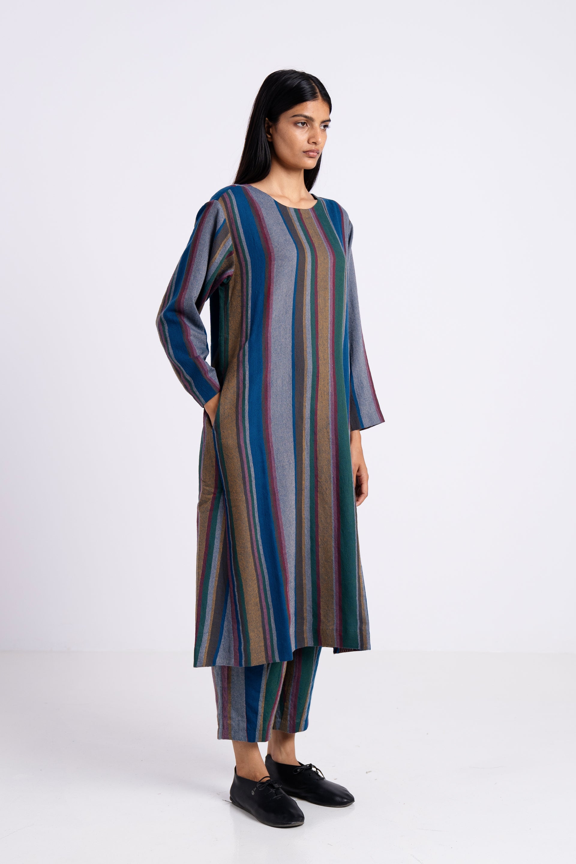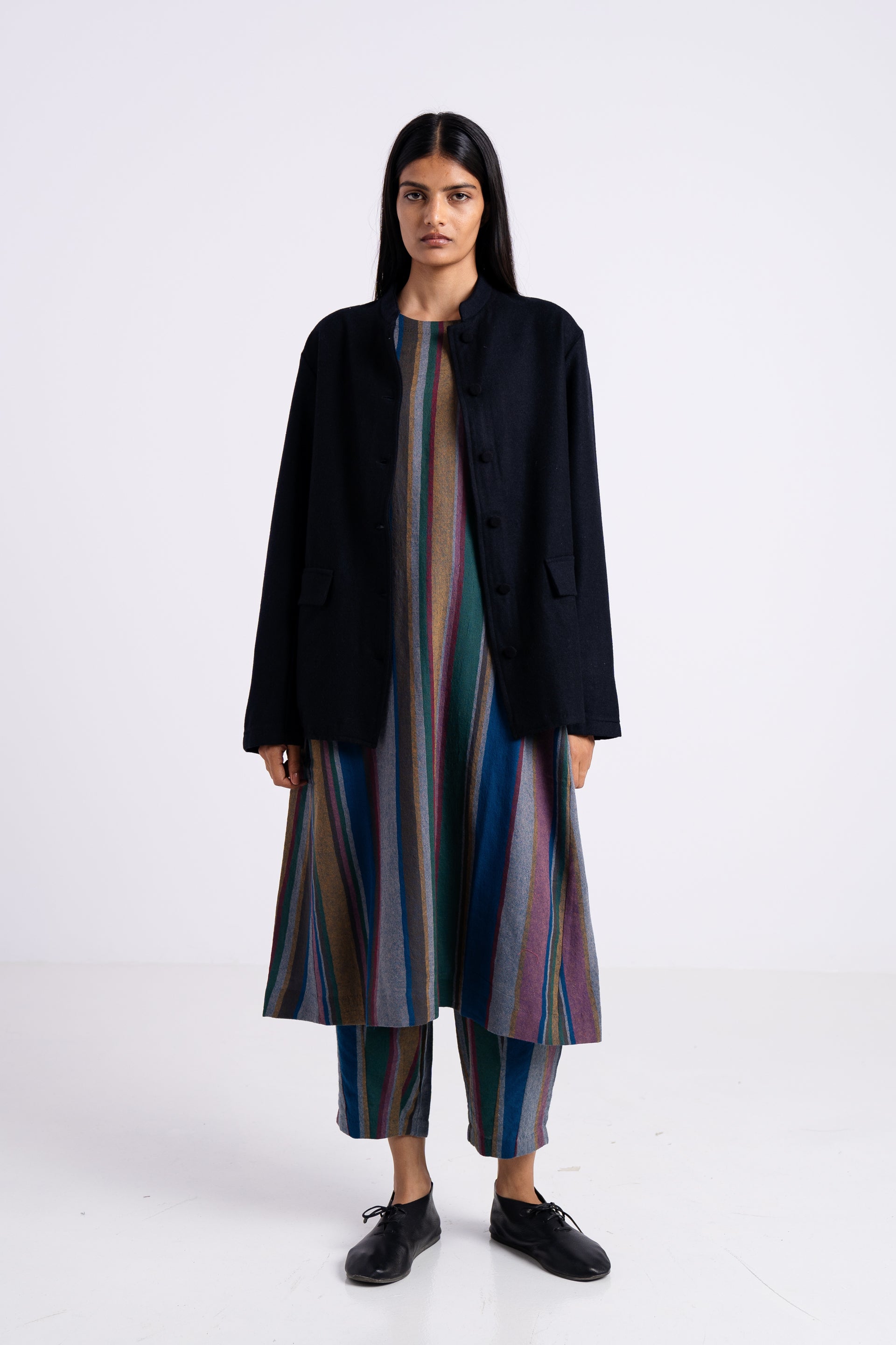 A-line round neckline midi dress. Constructed in hand quilted multi color striper in 100% merino wool and 100% silk. Finished with facing detail.