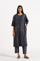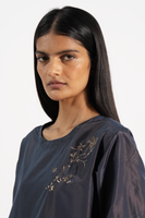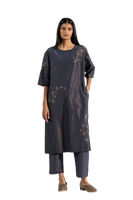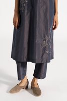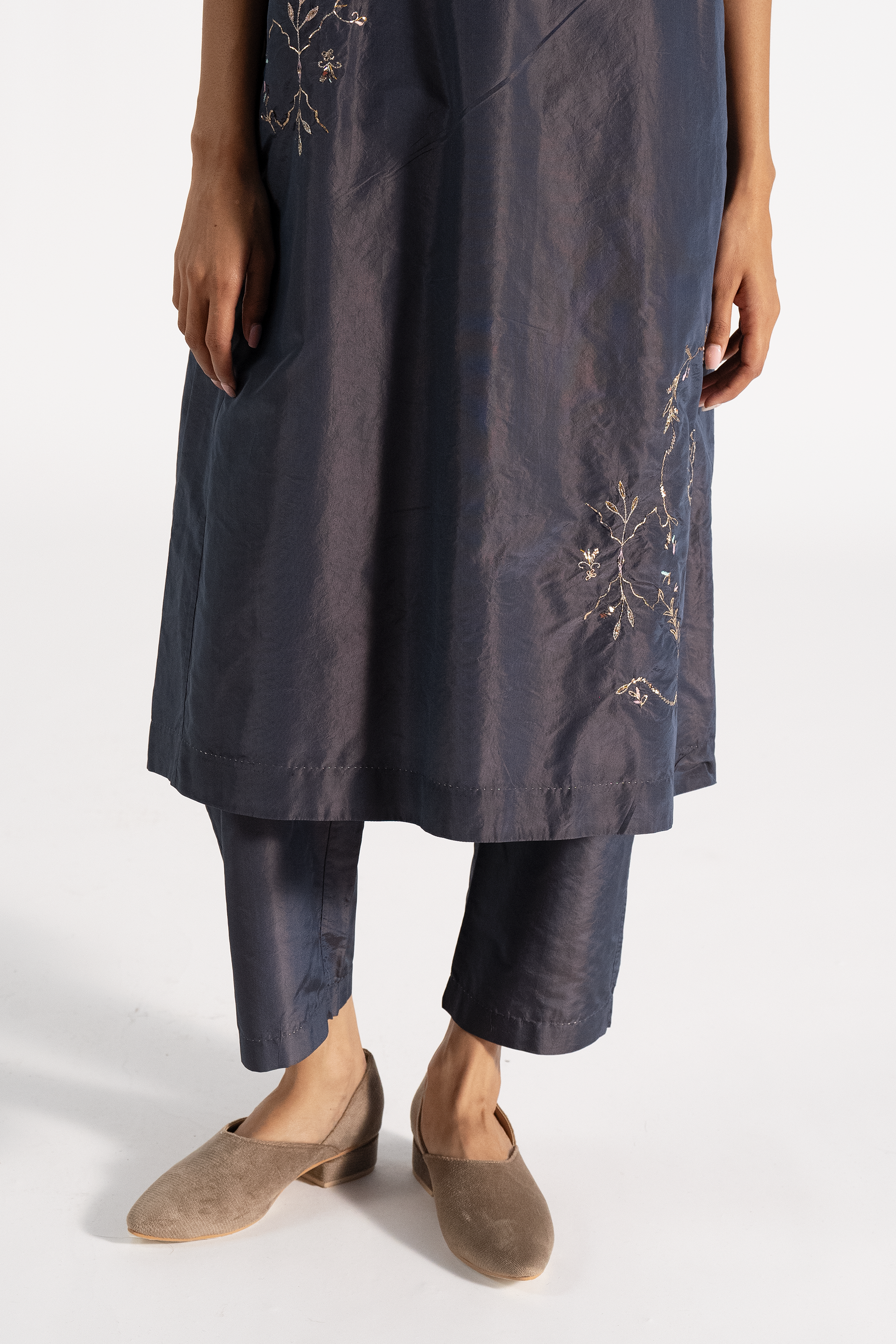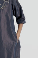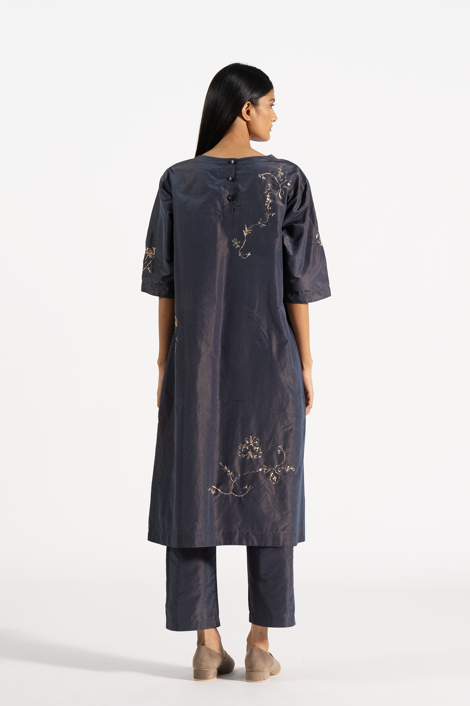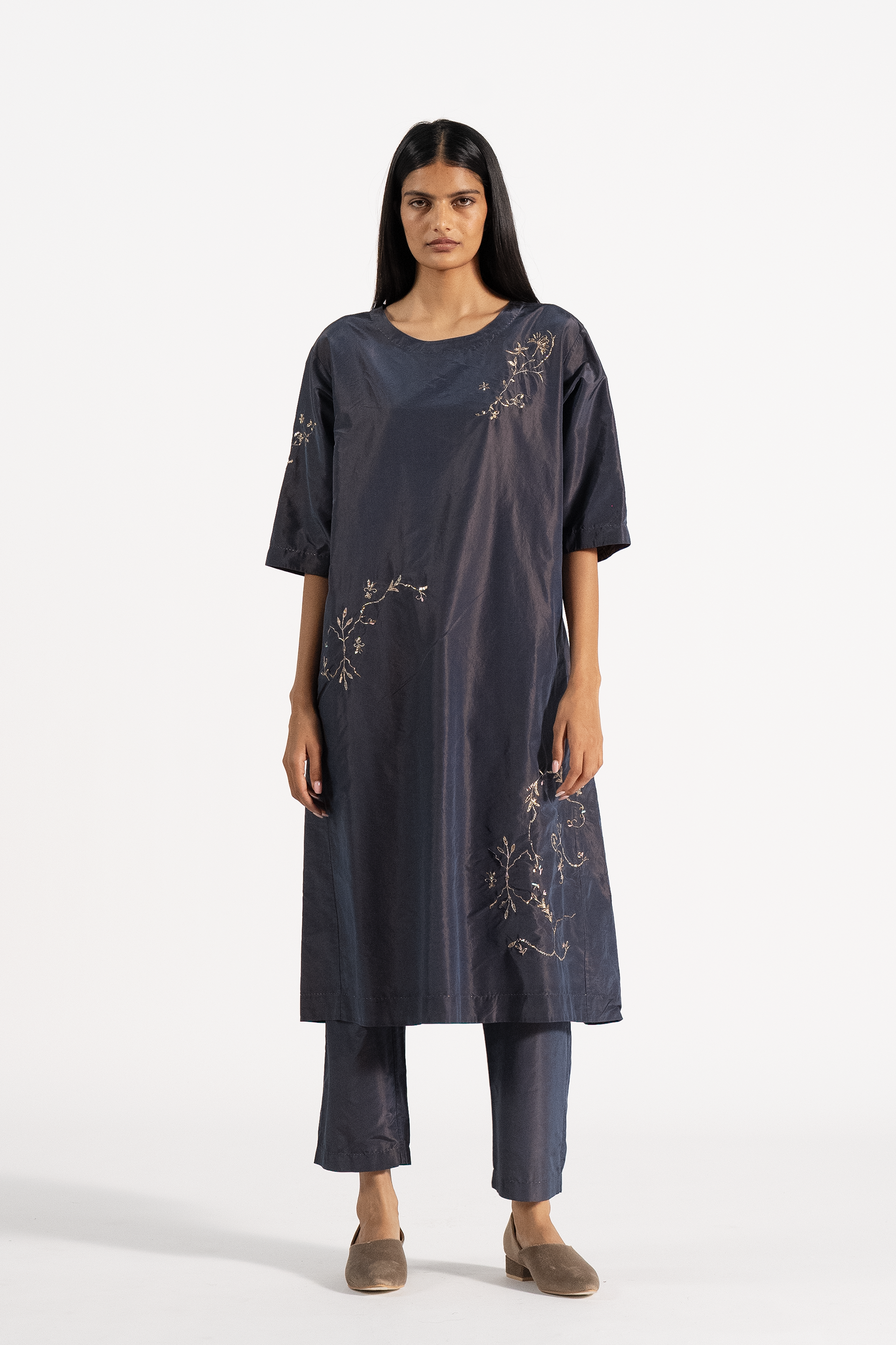 Round Neck, Semi Fitted Midi Length Kurta Dress With 3/4th Sleeves With Placement Hand Embroidery In 100% Silk Taffeta. Comes Along With A Pair Of Straight Fit Pants In Silk