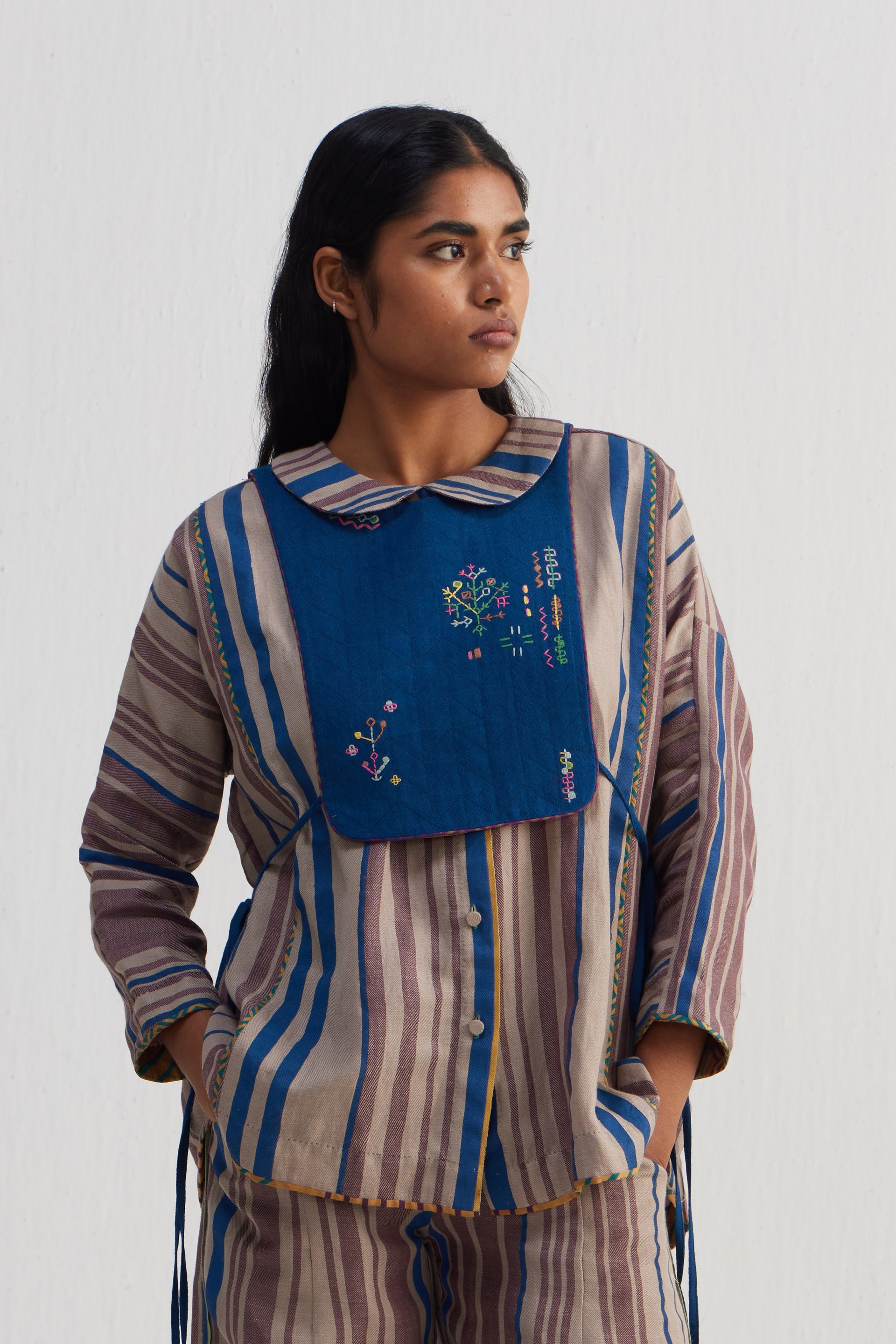 Round neckline side tye-up bib with curved hem cut detail, constructed in placement delicate kasuti motifs hand embroidery on 100% merino wool fabric. Finished with contrast collage handblock print 100% silk lining.