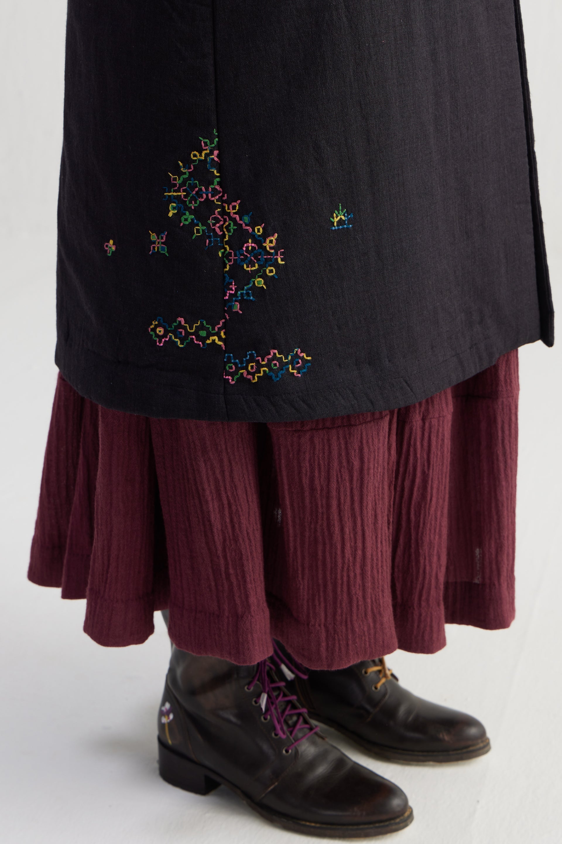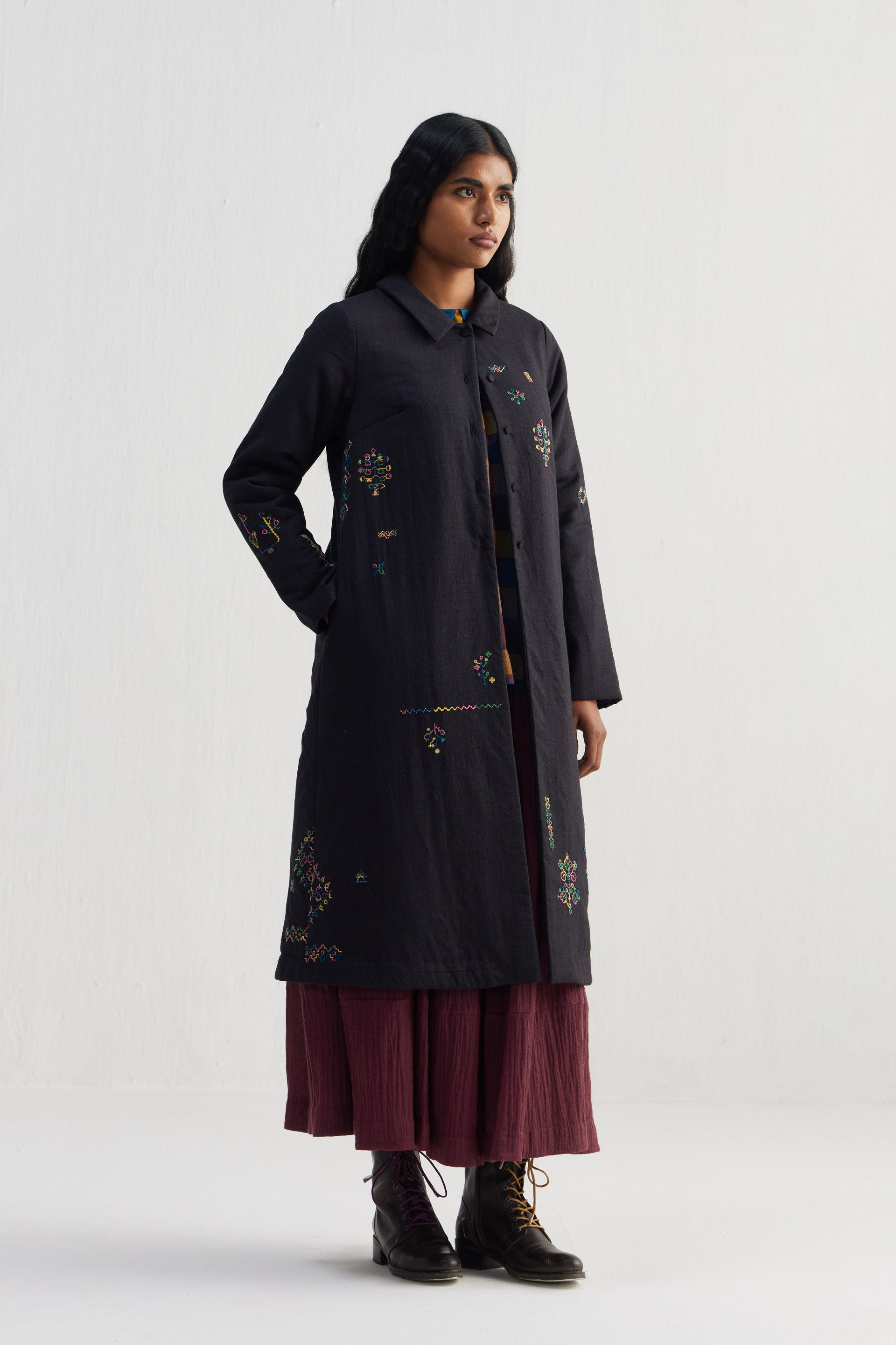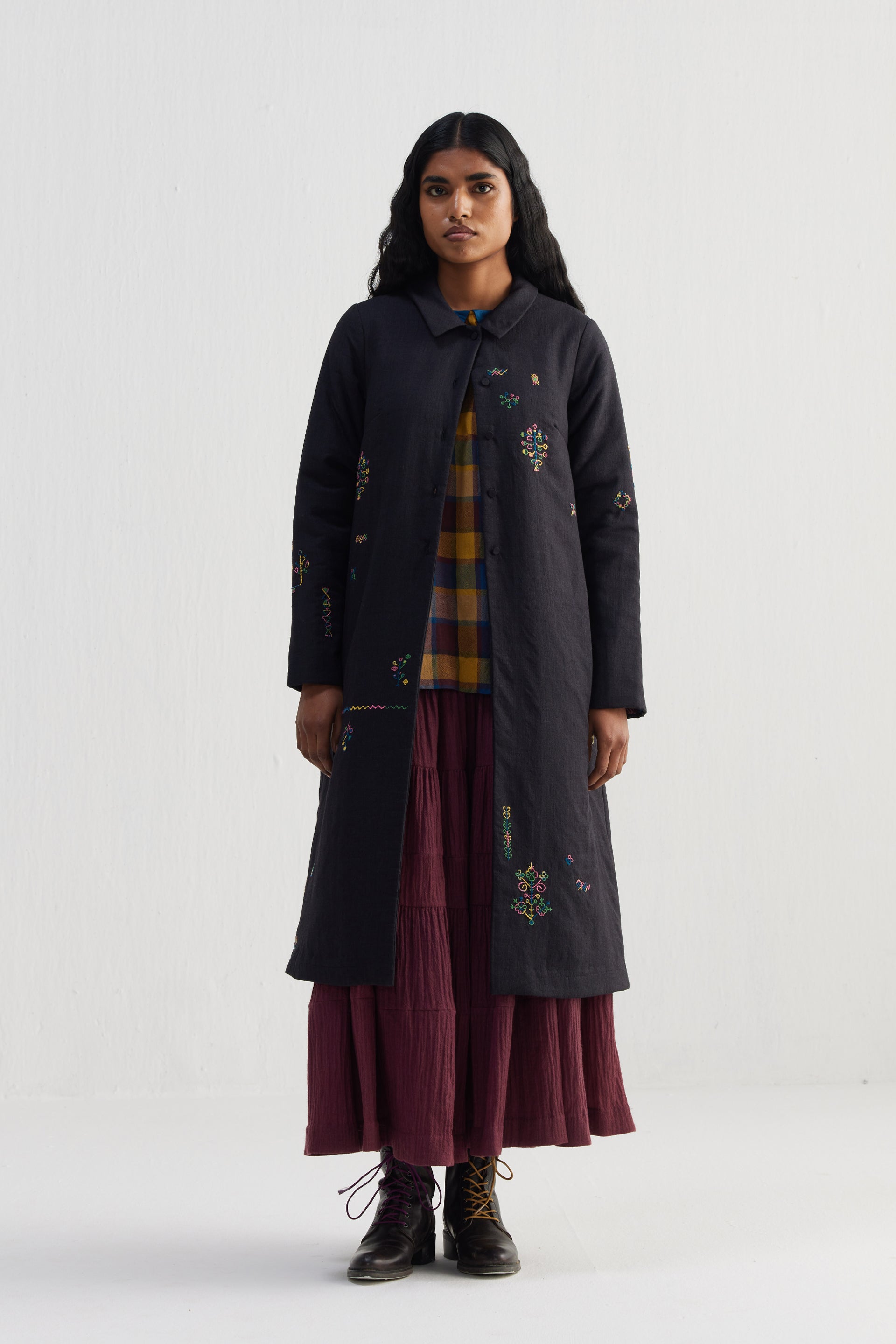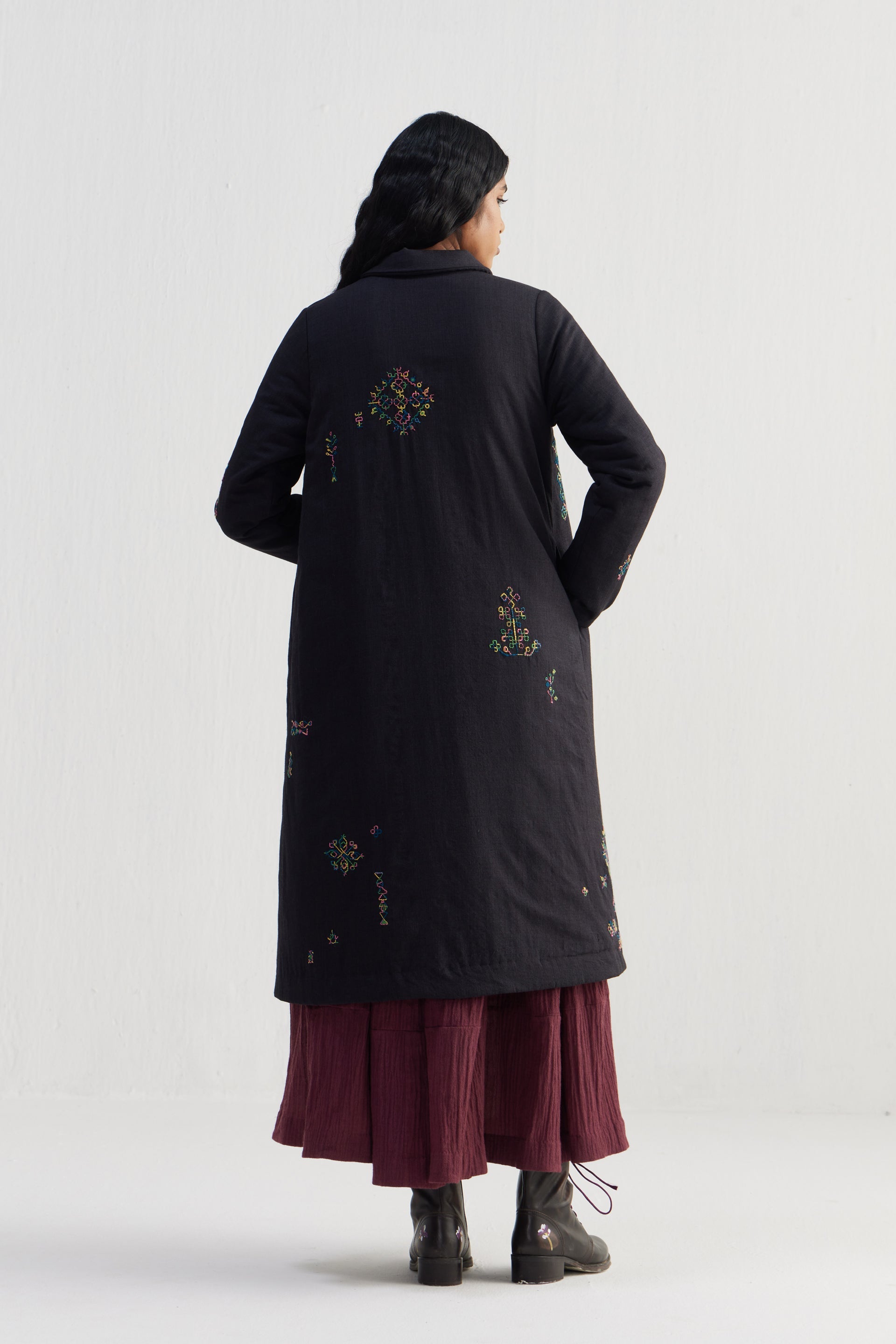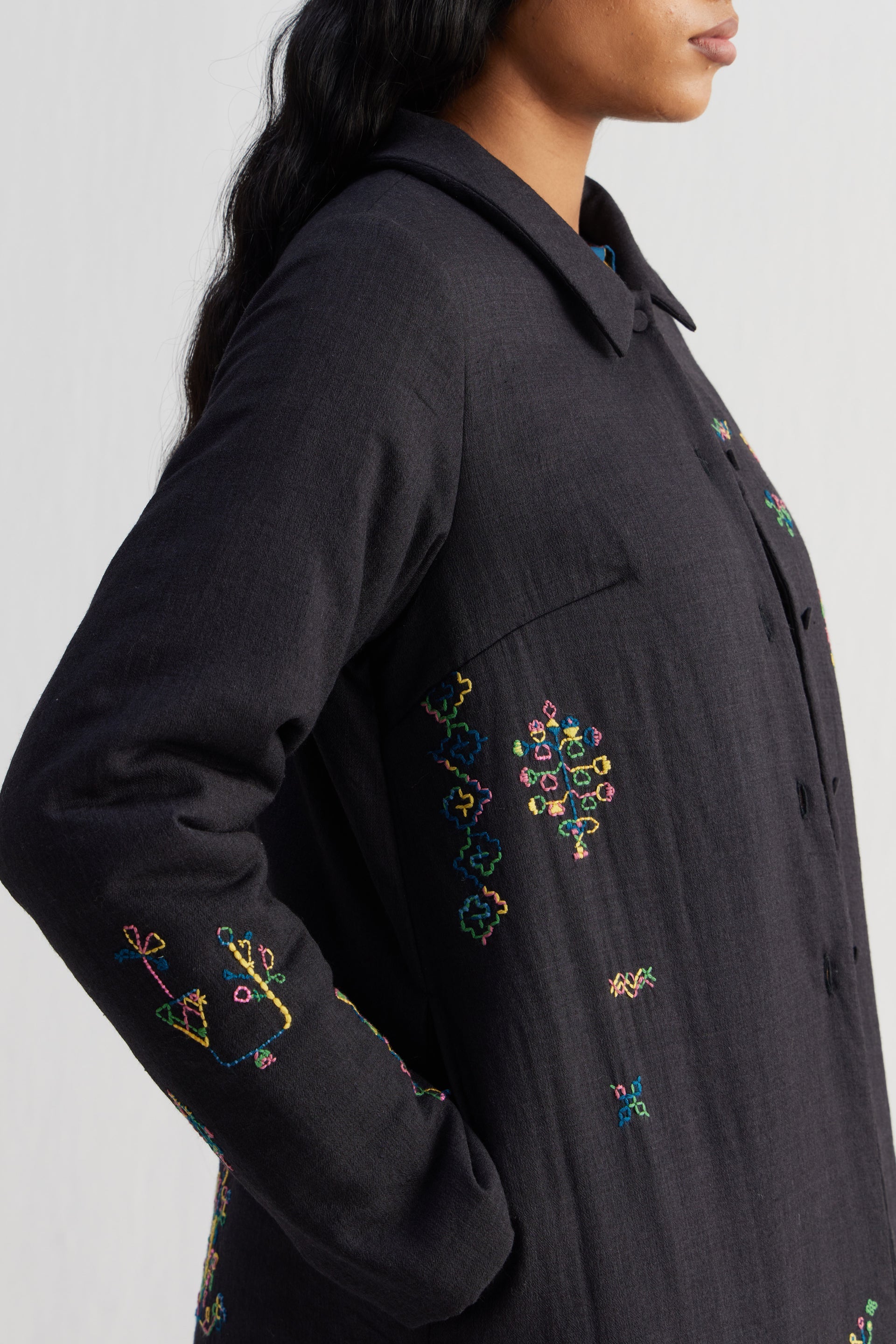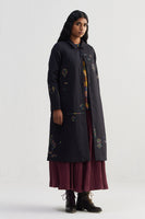 Straight fit flat collar button down full sleeves jacket. Constructed in placement delicate kasuti motifs hand embroidery on quilted wool silk linen fabric. Finished with contrast collage handblock print 100% silk lining.