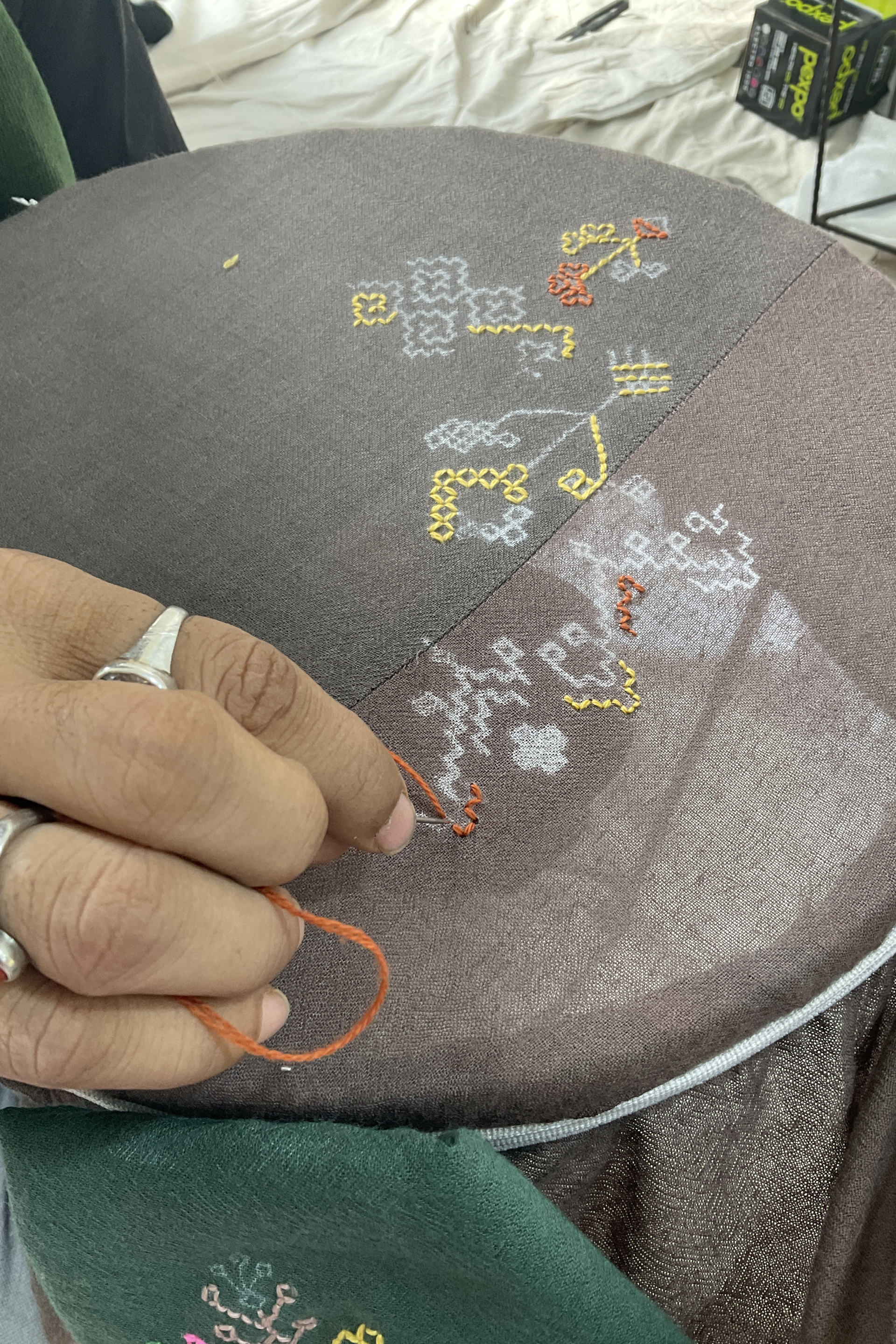 Kasuti—is a traditional folk style embroidery technique. It is known for intricate, geometric needlework. Reflecting themes from nature, temples, animals, and birds like peacocks and lotus flowers, each motif celebrates life with vibrant colors and patterns. In EKÁ, motifs are creatively broken up and reinterpreted on garments, blending diverse stitches and colors for a contemporary look that honors Kasuti’s handmade heritage.