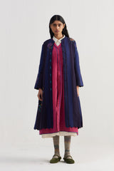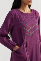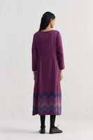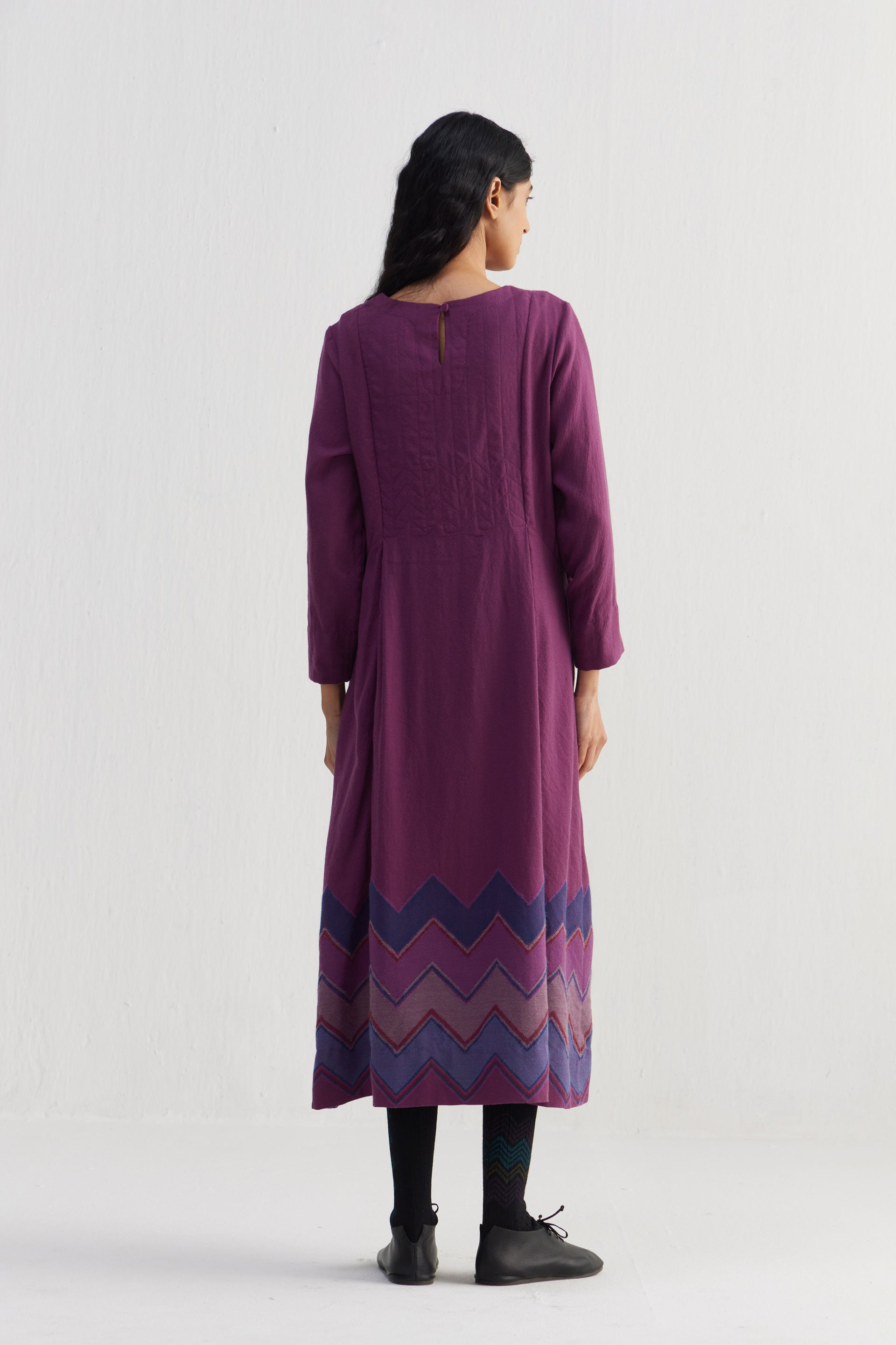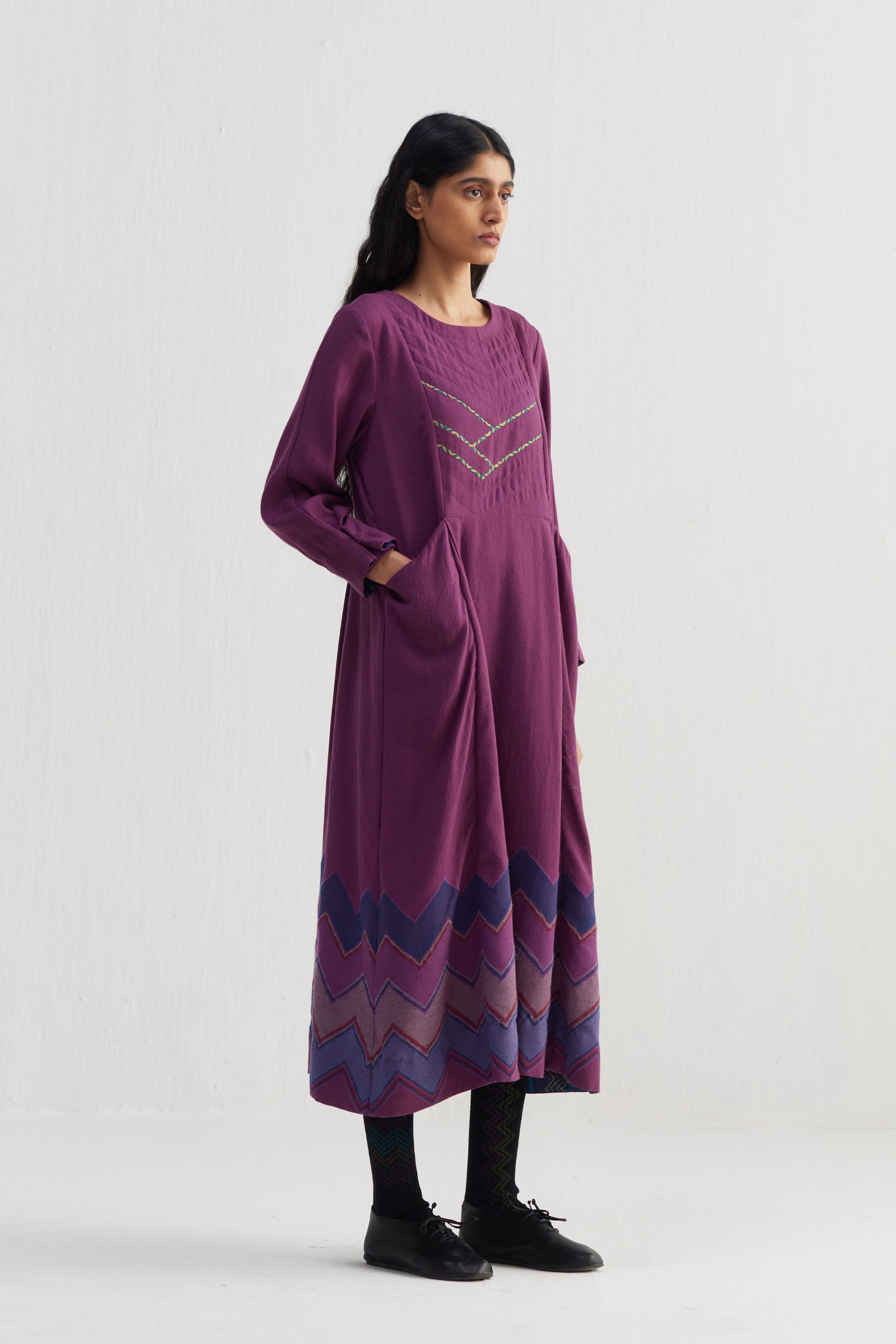 Round neckline midi dress with chevron border jacquard at hem and inseam pockets.Constructed in 100% wool with a quilted yoke and contrast piping binding. Finished with contrast handblock print piping detail and collage handblock print 100% silk fabric facing detail.