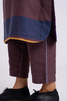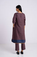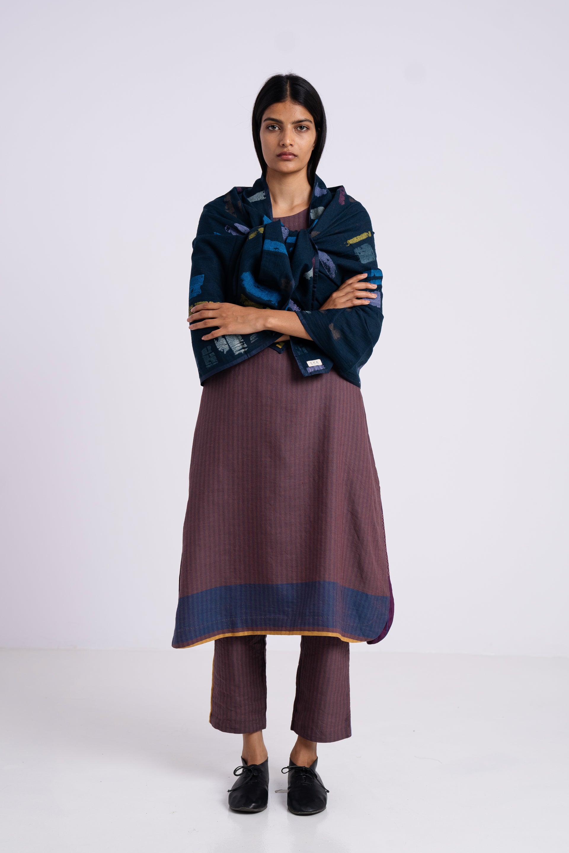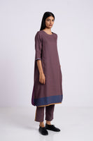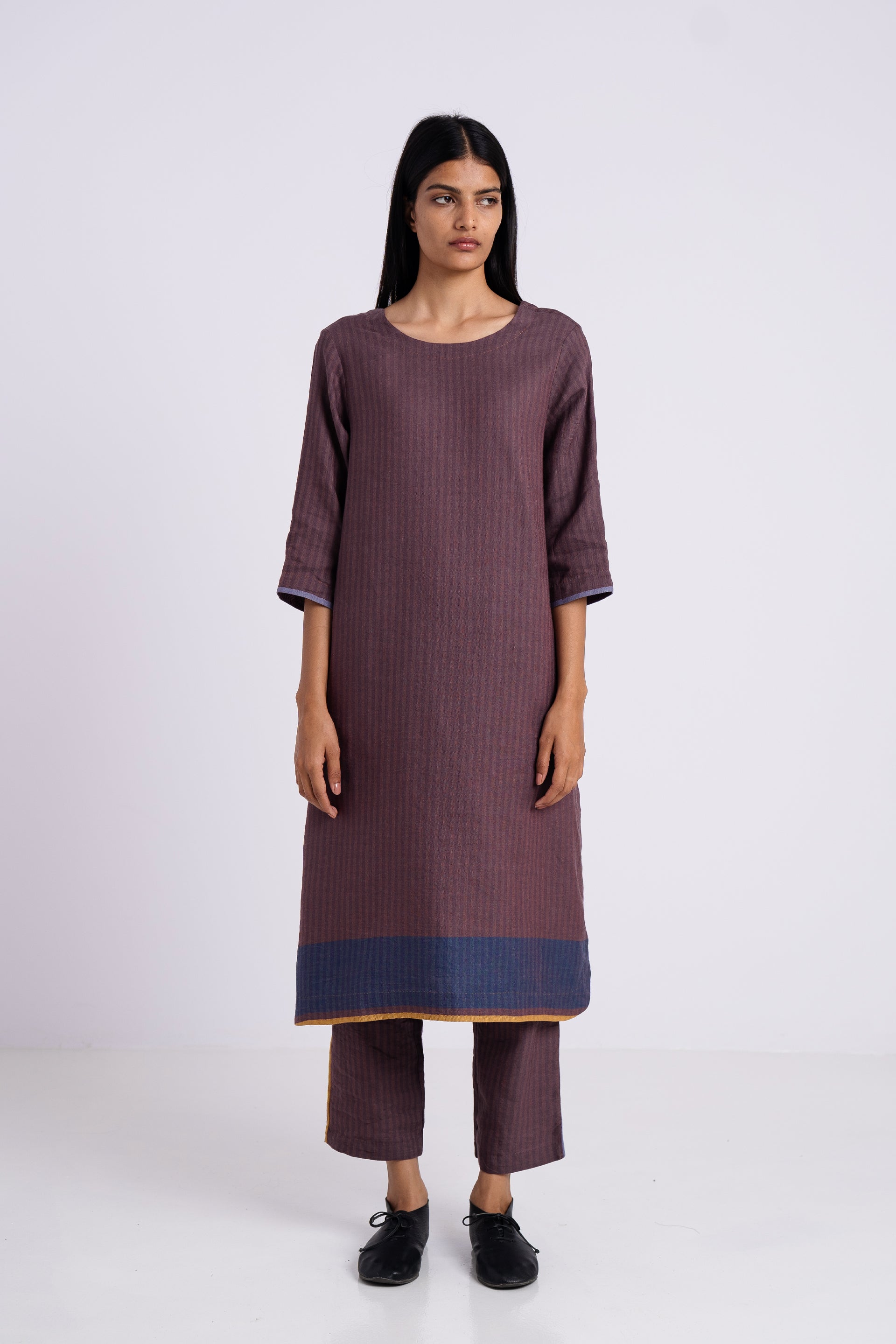 Straight fit tunic with curved hem in 100% wool linen with contrast selvedge detail on sleeves . Paired with straight fit trouser.