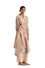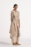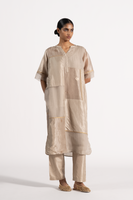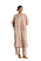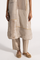 Straight Kurta With Curved Hems And Pachtwork Detail In Jaquard Butti Organza, Solid Organza & 100% Silk & Gold Binding. Comes With A Separate Cotton Silk Lining And Solid Silk Pants Lined Witth Handloom Cotton Silk.