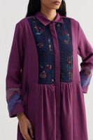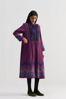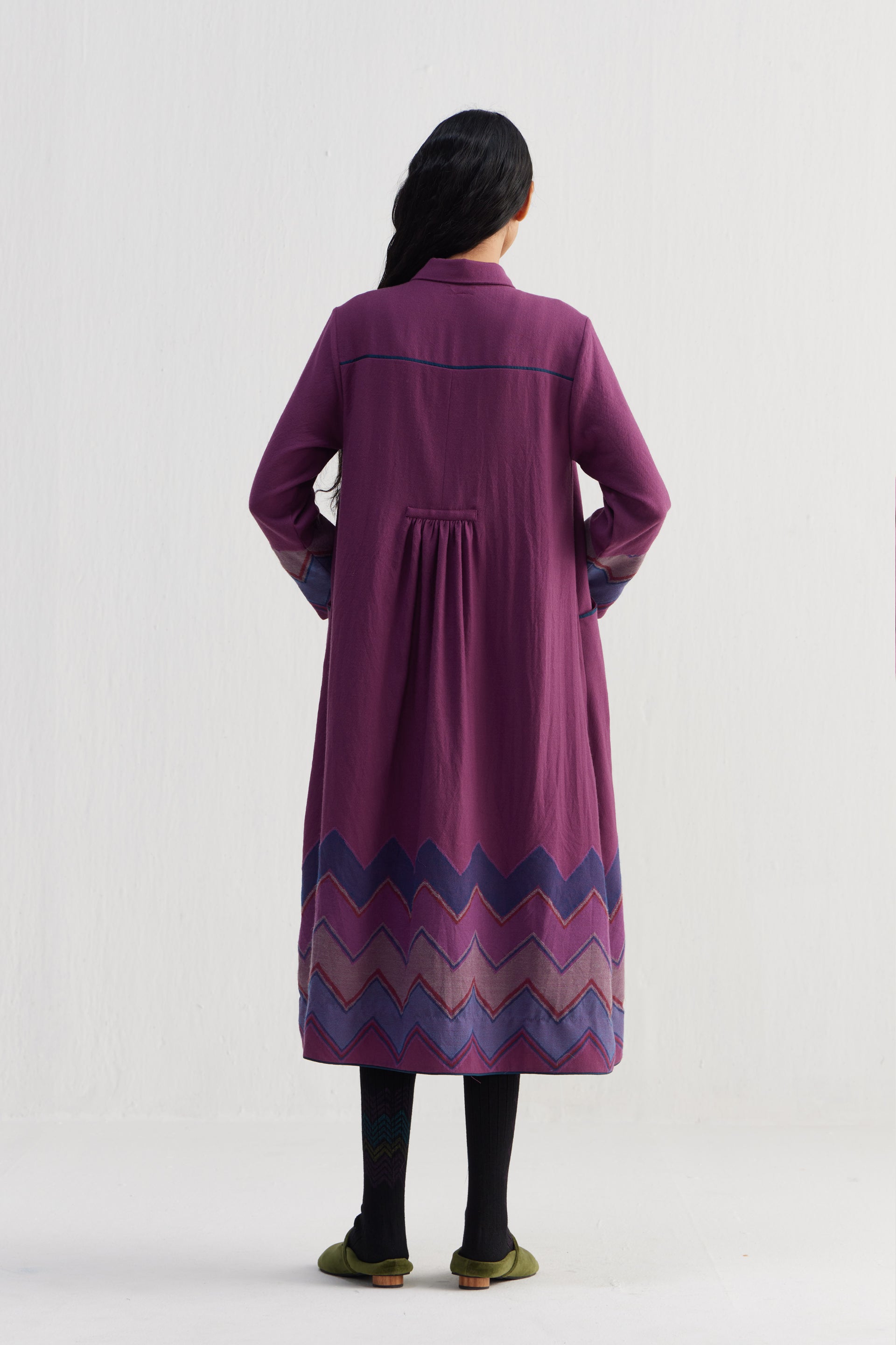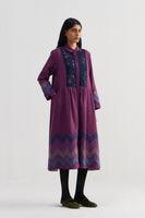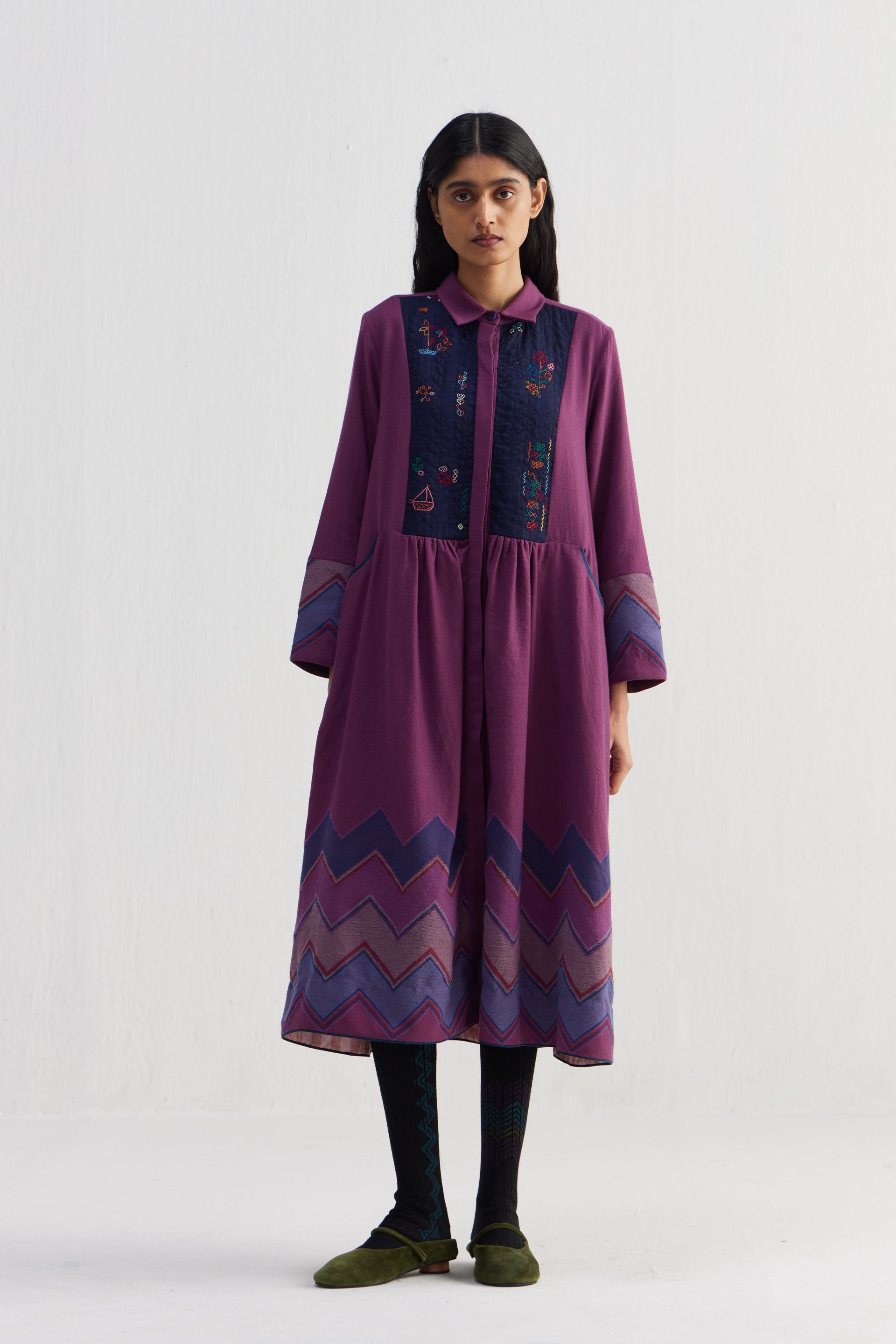 Relaxed fit front open button down collar midi dress with gathers on the waist and joint on sleeves and chevron border jacquard at hem.Constructed in 100% merino wool with hand embroidery on a quilted yoke . Finished with contrast hand block print piping detail and collage hand block print 100% silk fabric facing detail.