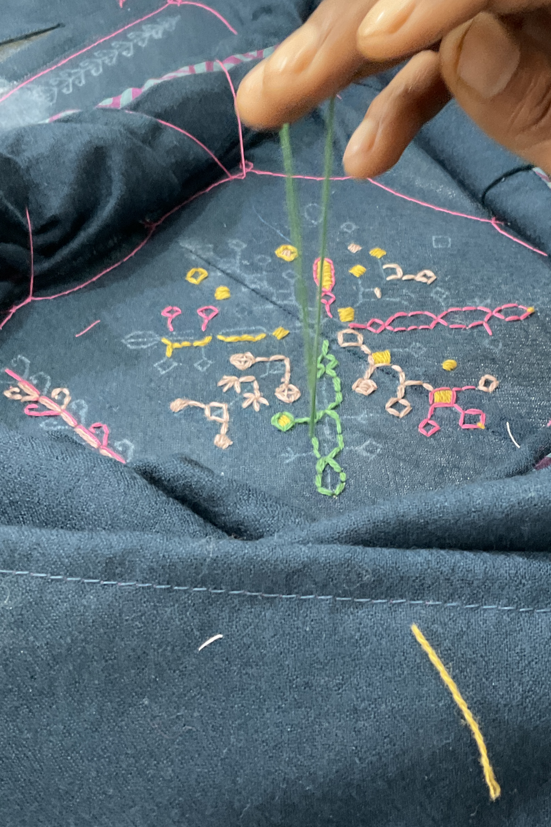 Kasuti—is a traditional folk style embroidery technique. It is known for intricate, geometric needlework. Reflecting themes from nature, temples, animals, and birds like peacocks and lotus flowers, each motif celebrates life with vibrant colors and patterns. In EKÁ, motifs are creatively broken up and reinterpreted on garments, blending diverse stitches and colors for a contemporary look that honors Kasuti’s handmade heritage.