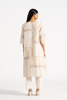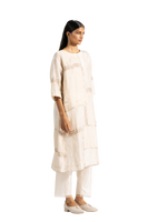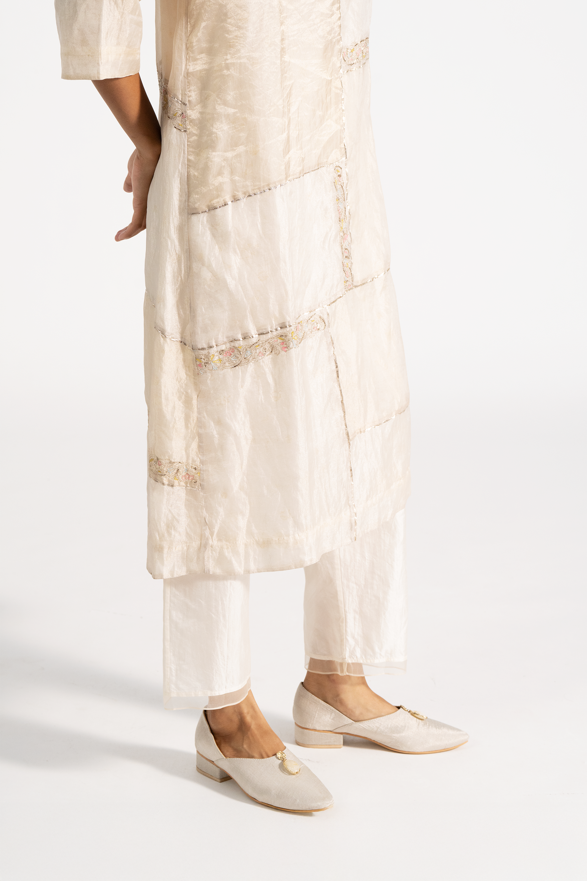 Multicolor patchwork kurta with attached block printed silk lining. Comes with straight fit linen silk trouser with organza border on hem.