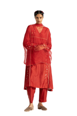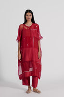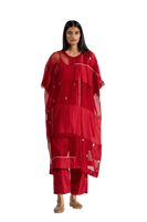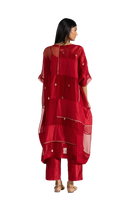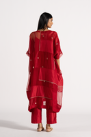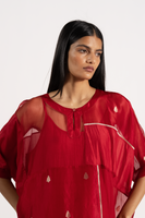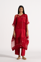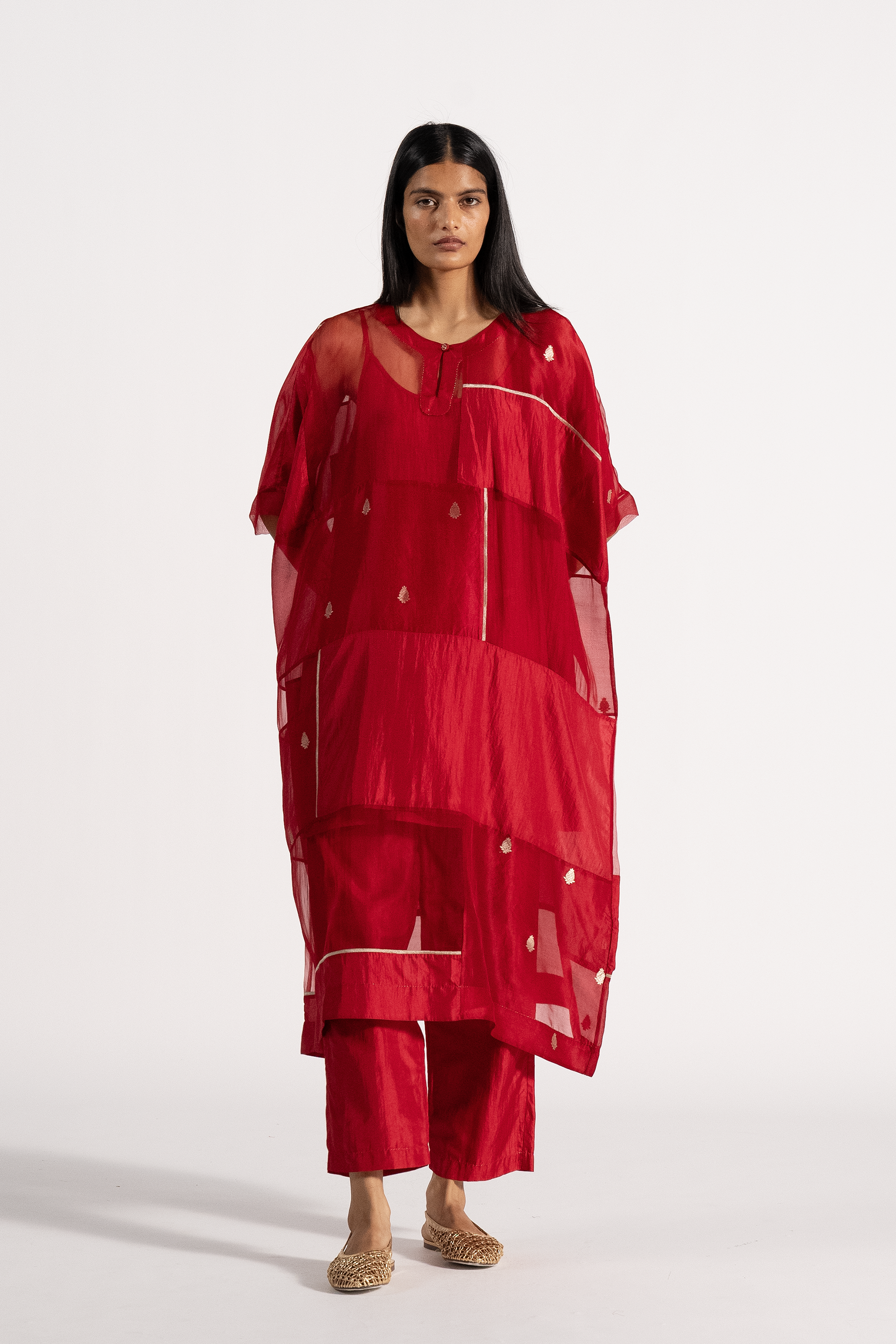 An Oversized Round Neck Kaftan Style Dress With Pachtwork Detail In Jaquard Butti Organza, Solid Organza & 100% Silk & Gold Binding. Comes With A Separate Cotton Silk Lining