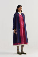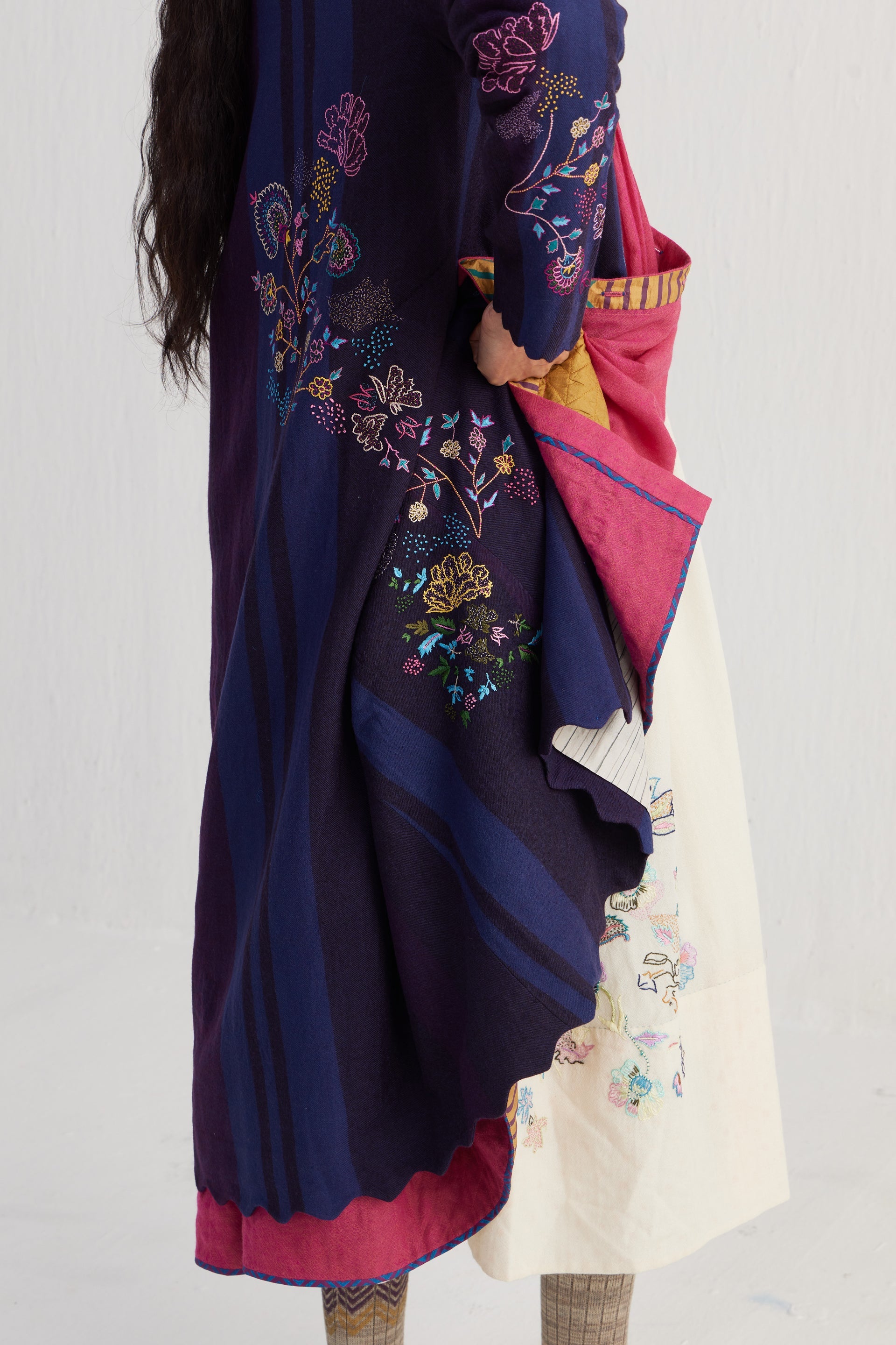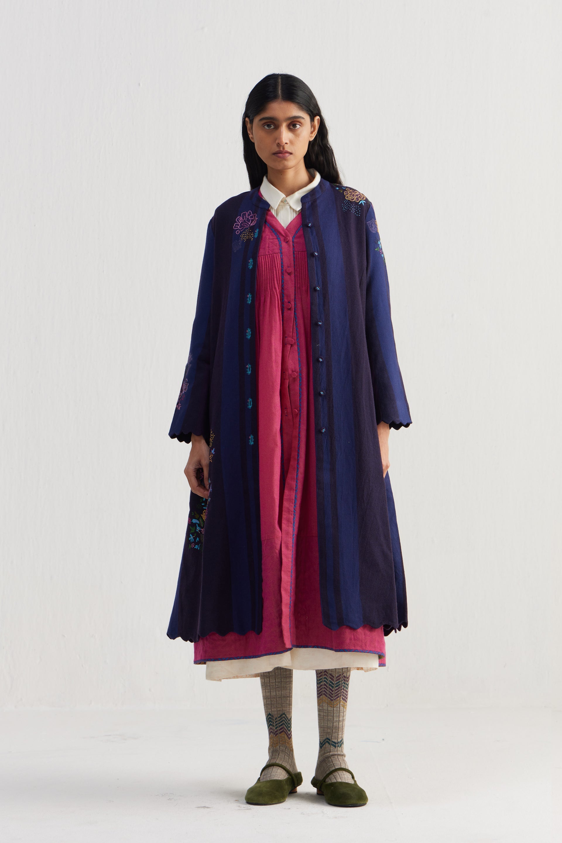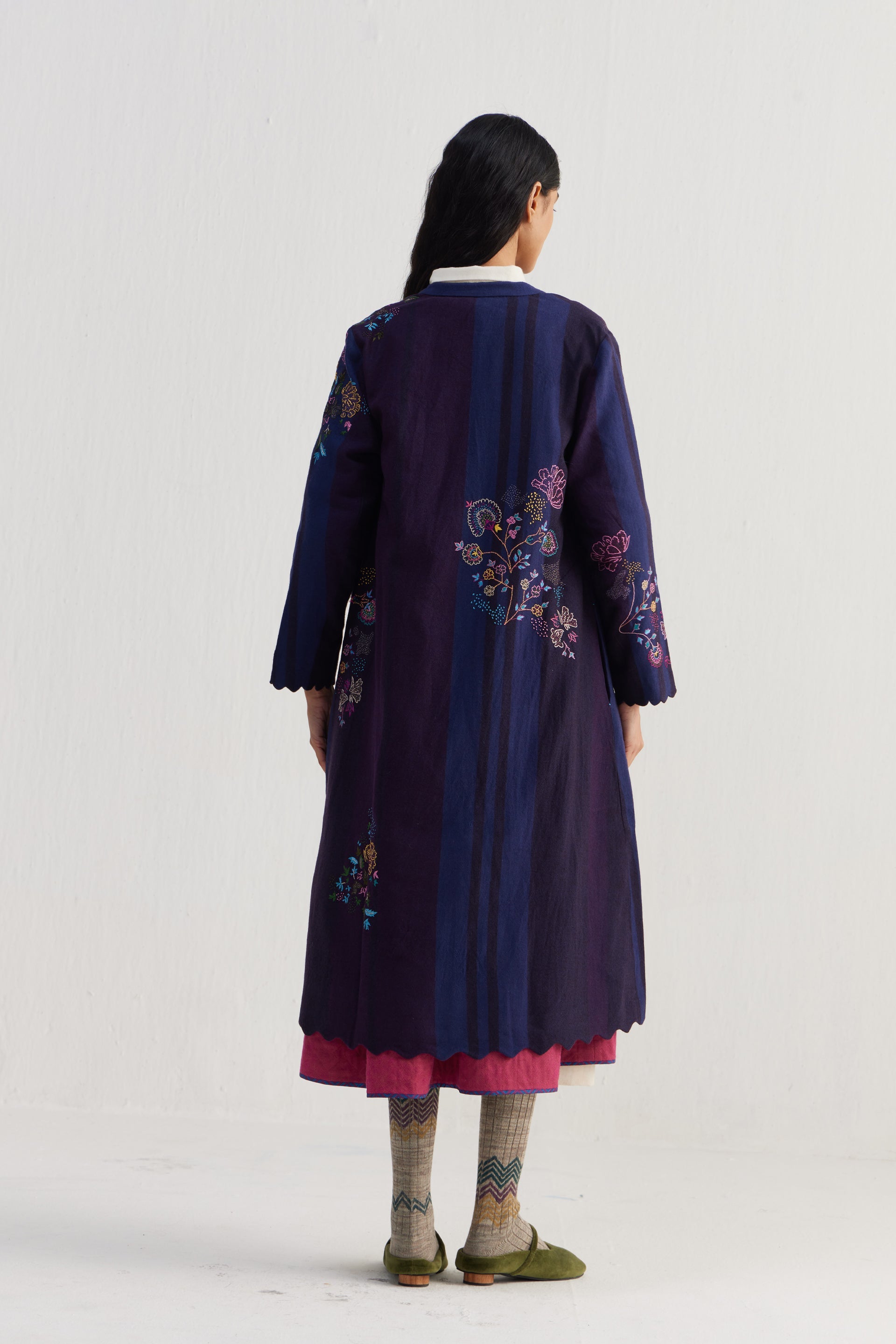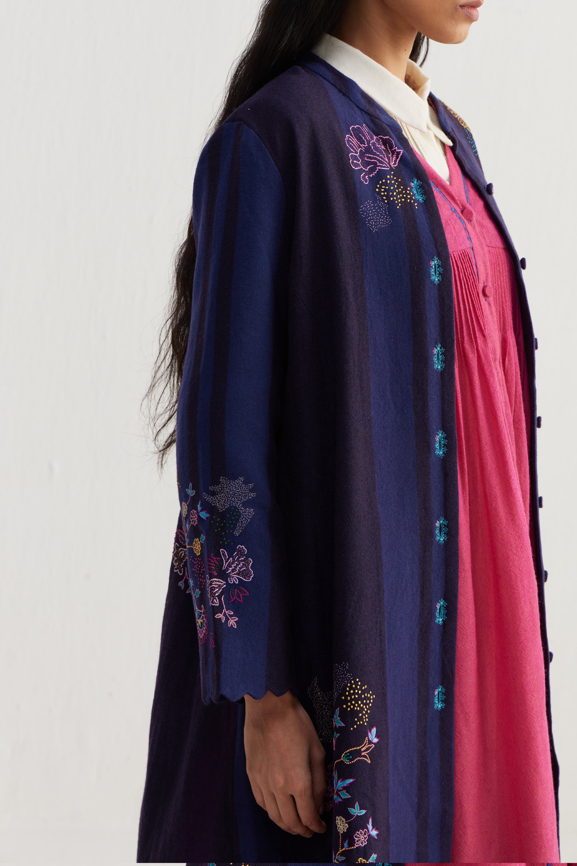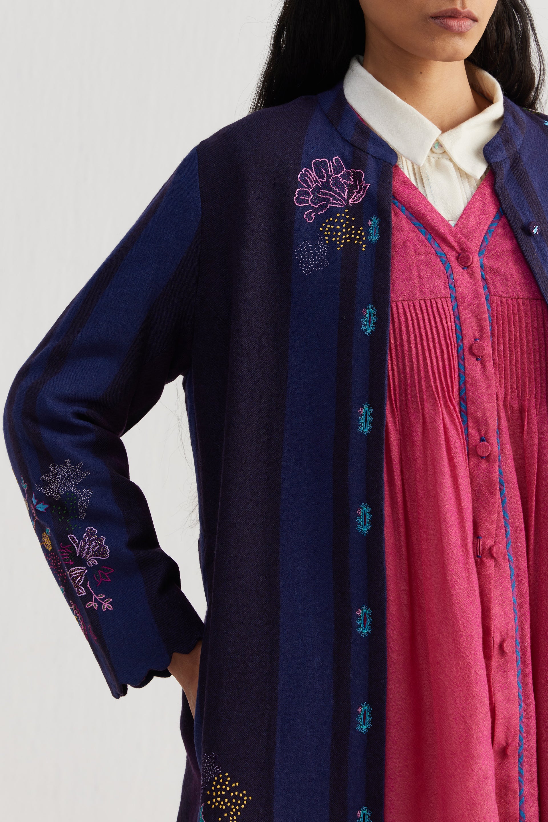 Straight fit mandarin collar full sleeves midi jacket with scallop detail on hem. Constructed in placement intricate sozni motifs hand embroidery on 100% merino wool fabric. Finished with contrast collage handblock print 100% silk lining.