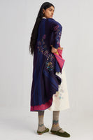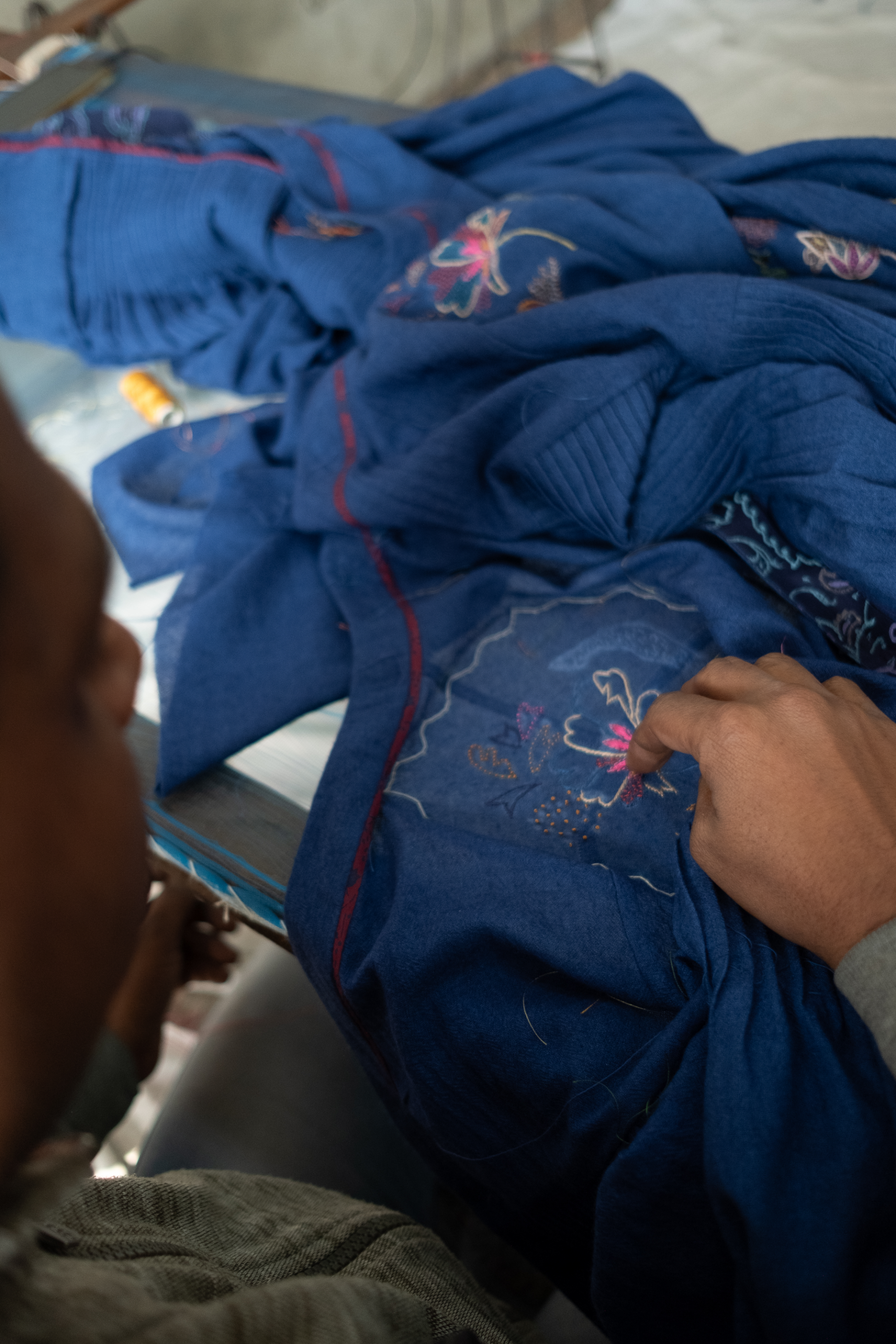 Sozni embroidery—is a 500 year old needle craft embroidery passed down through generations. Each piece reimagines traditional motifs with delicate chain stitches in silk and wool threads. Originally sozni was done in Kashmir on pashmina wool shawls in silk threads. We’ve used the dexterity and elegance of sozni and contemporized it in patterns, colors, and stitch variations.