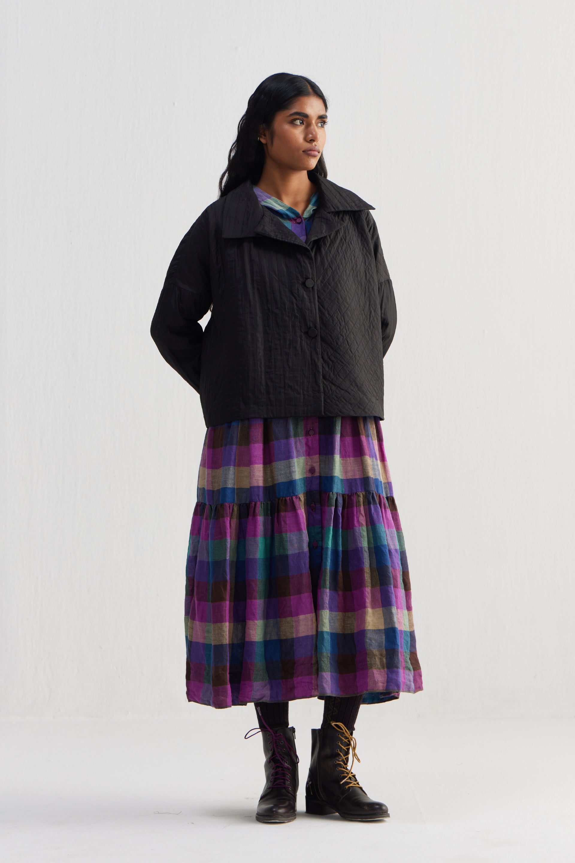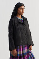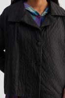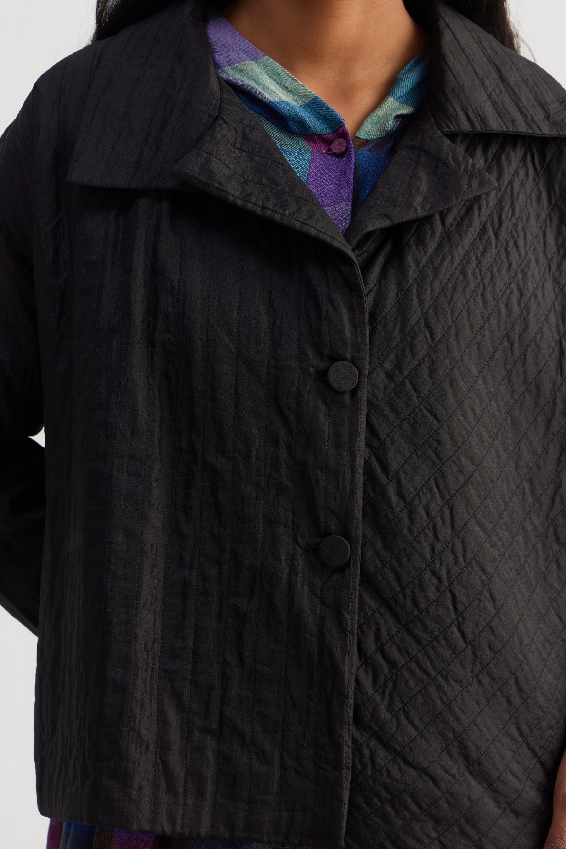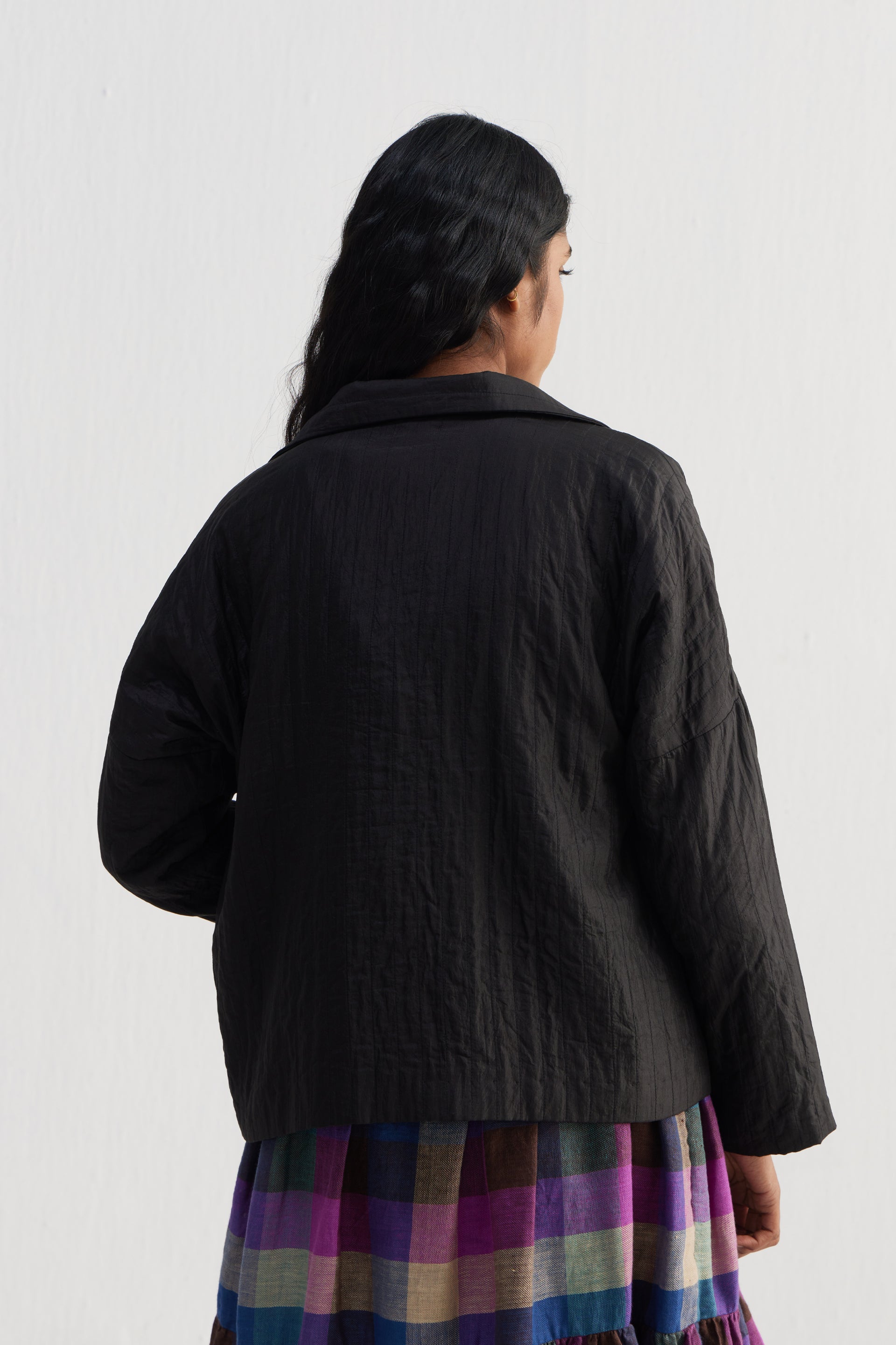 Full sleeves relaxed fit notch collar short jacket. Constructed in solid all-over quilted 100% silk fabric. Finished with solid 100% silk lining.