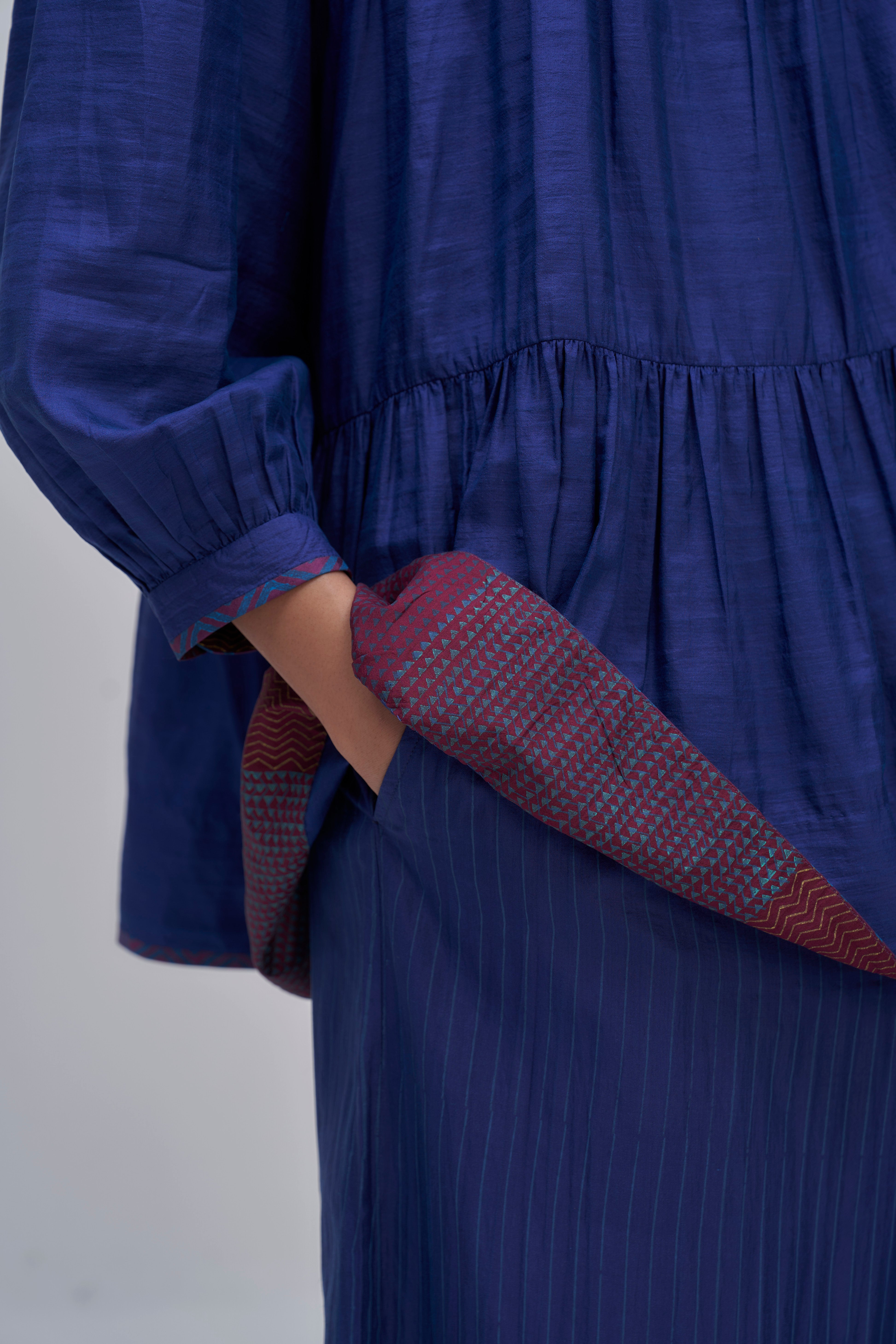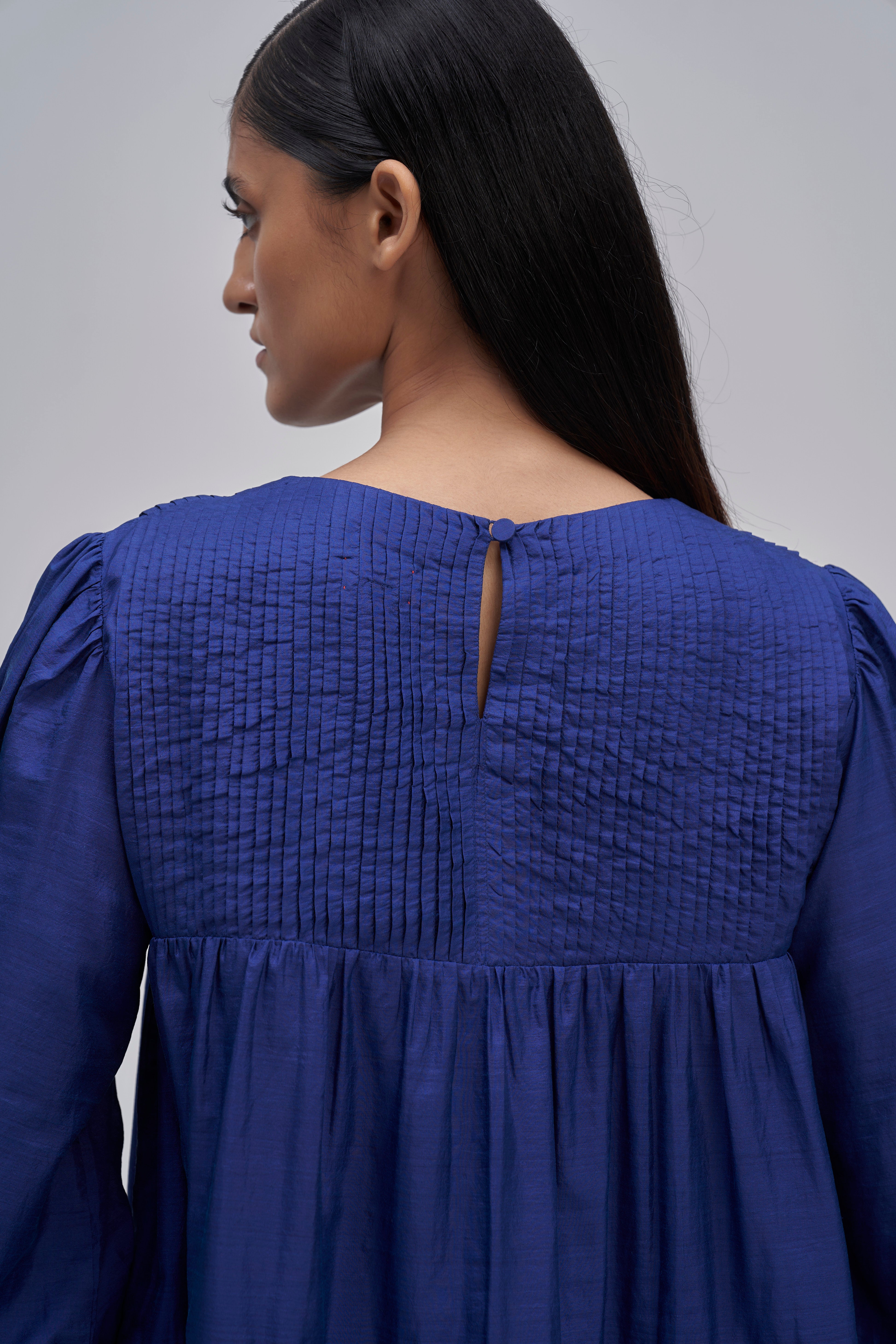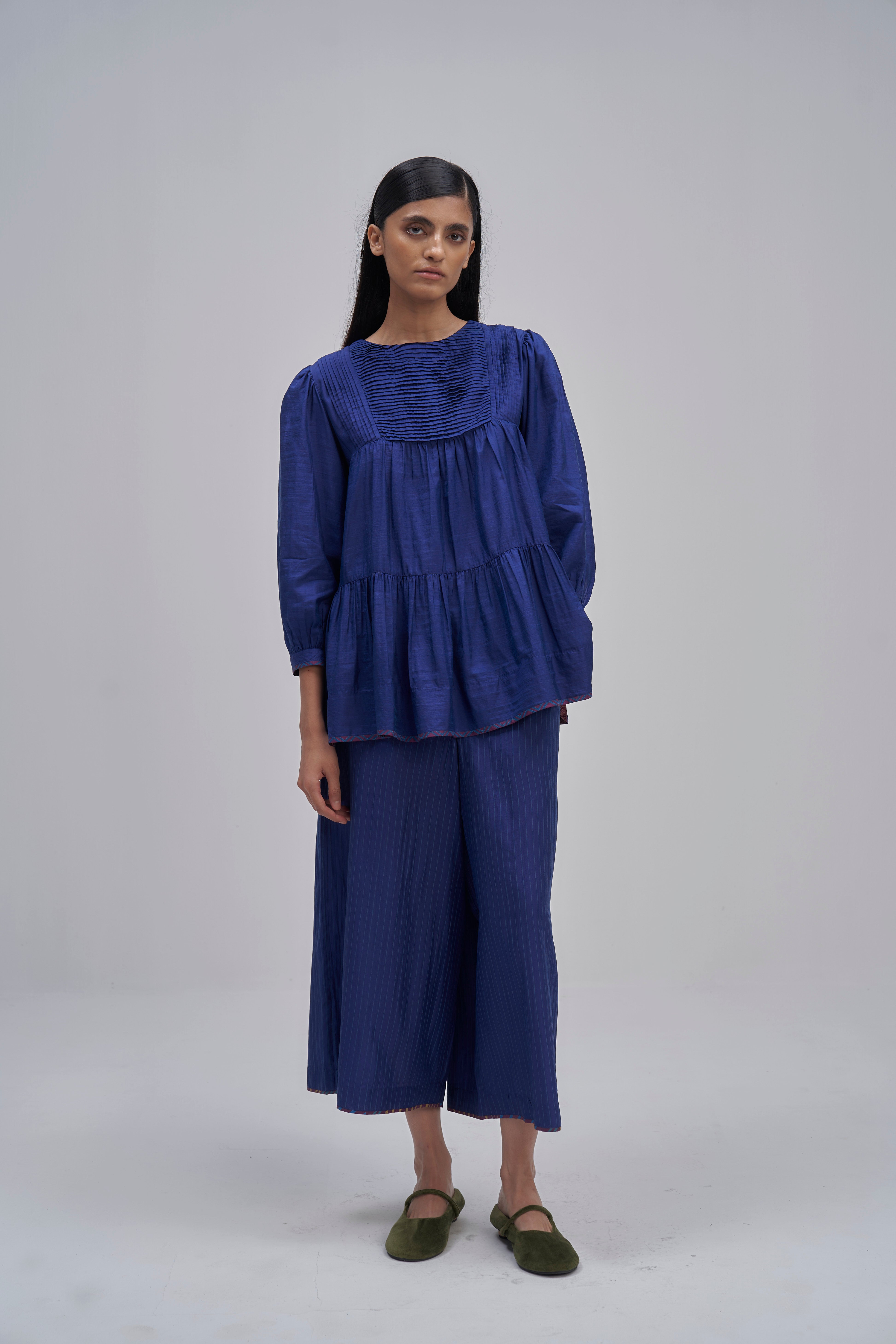 Round neckline relaxed fit full sleeves top with light puff, tiers, gathers and pintuck detail. Constructed in solid 100% silk fabric. Finished with contrast handblock print 100% silk binding detail on cuffs, hem and facing detail.