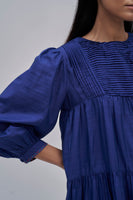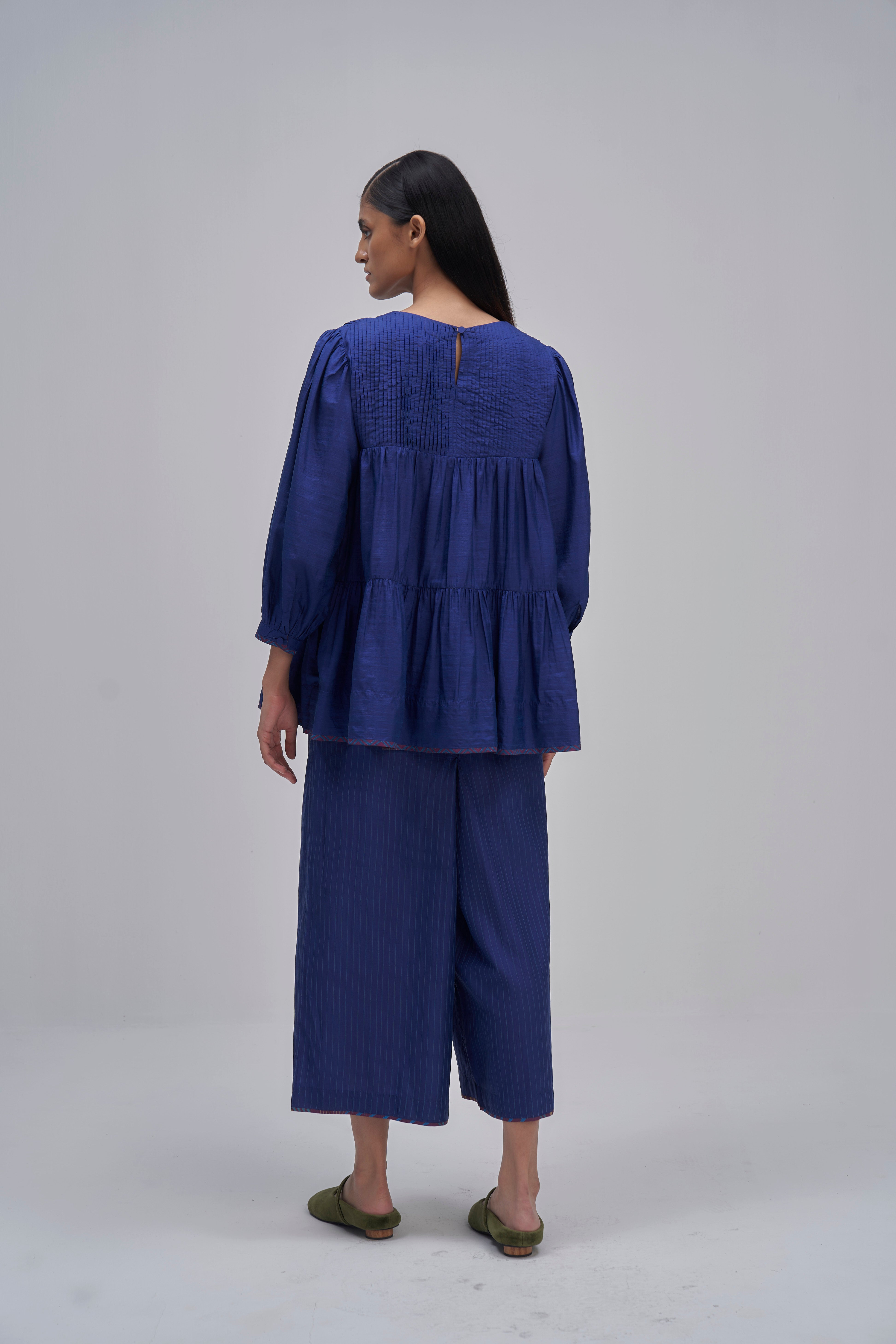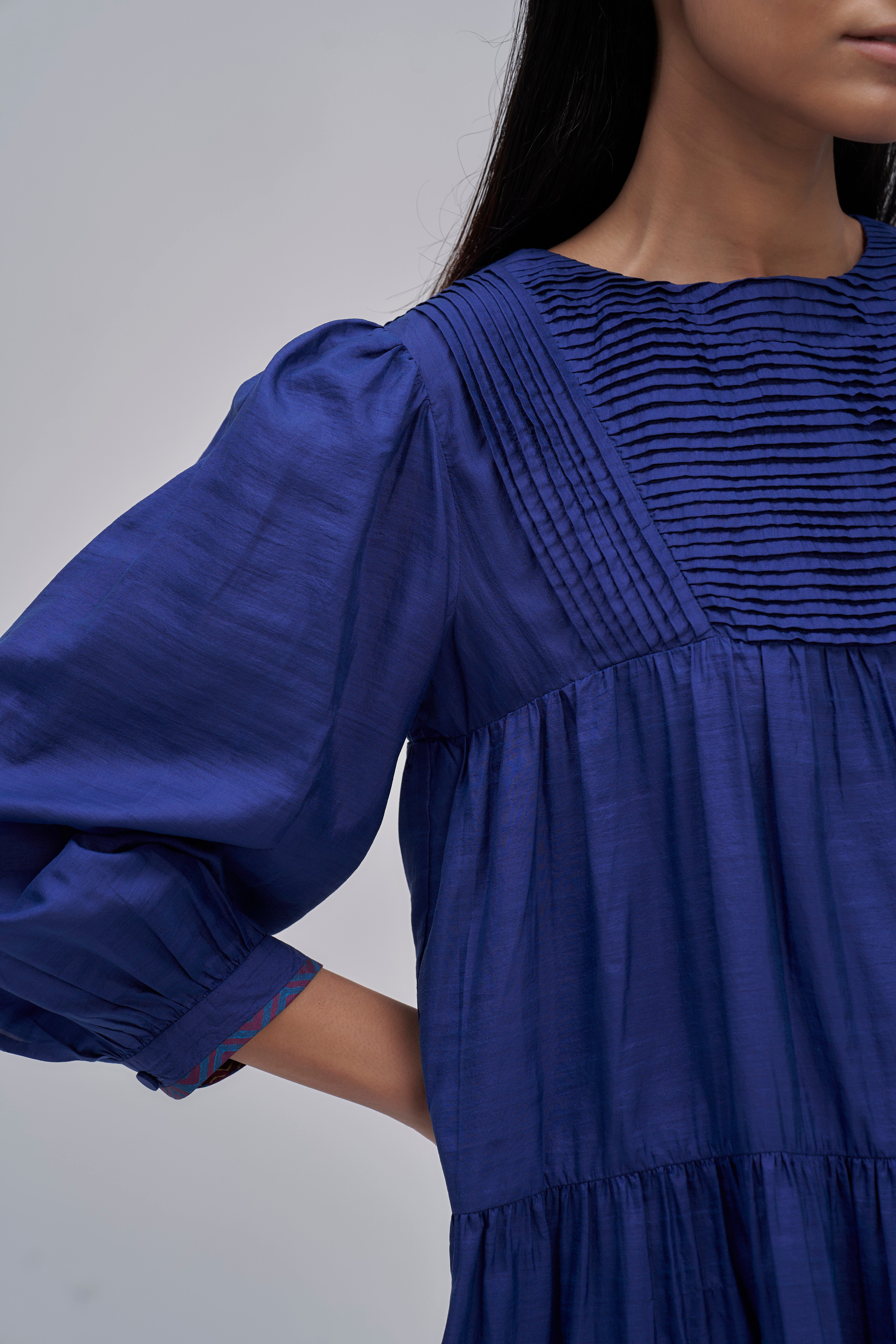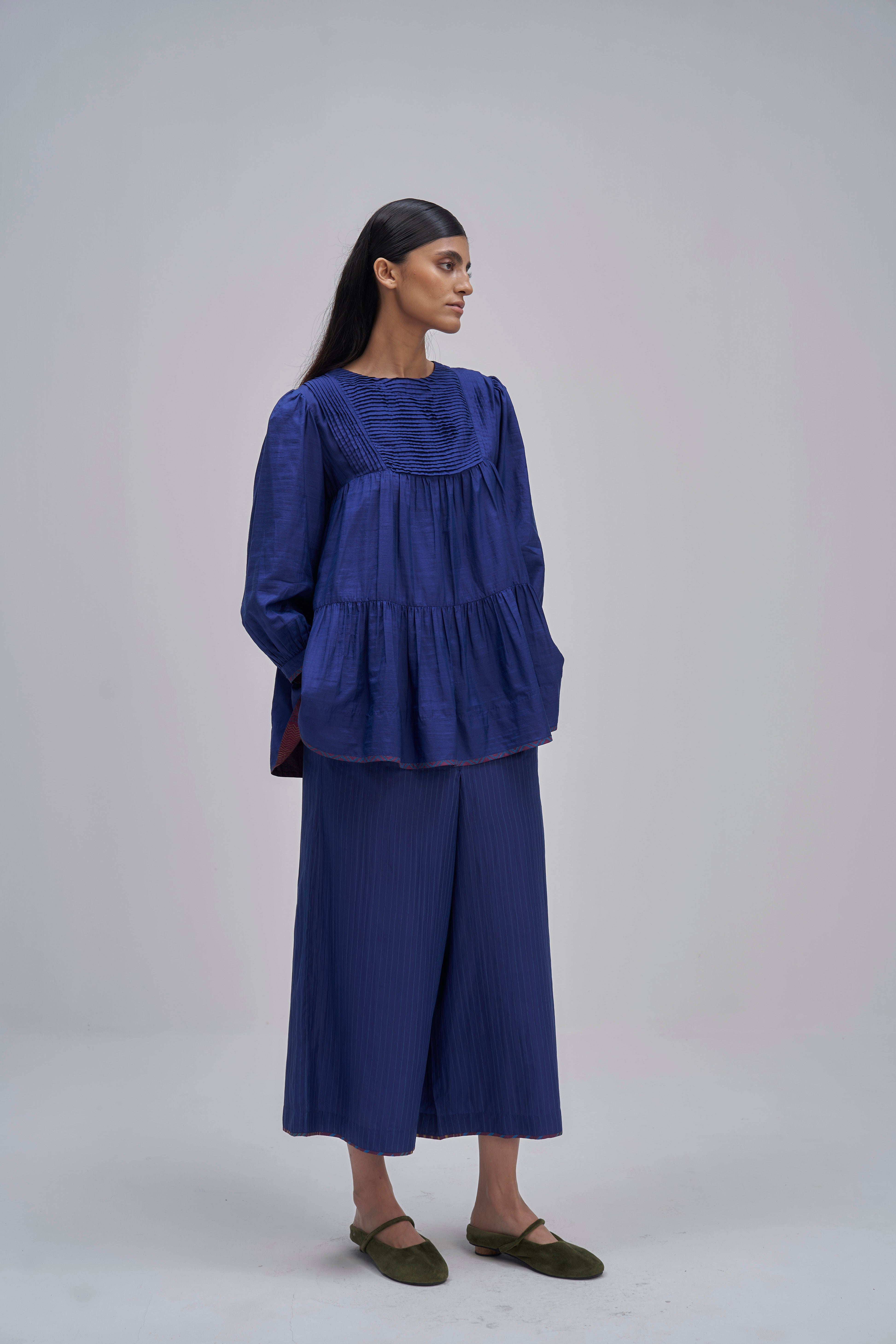 Round neckline relaxed fit full sleeves top with light puff, tiers, gathers and pintuck detail. Constructed in solid 100% silk fabric. Finished with contrast handblock print 100% silk binding detail on cuffs, hem and facing detail.